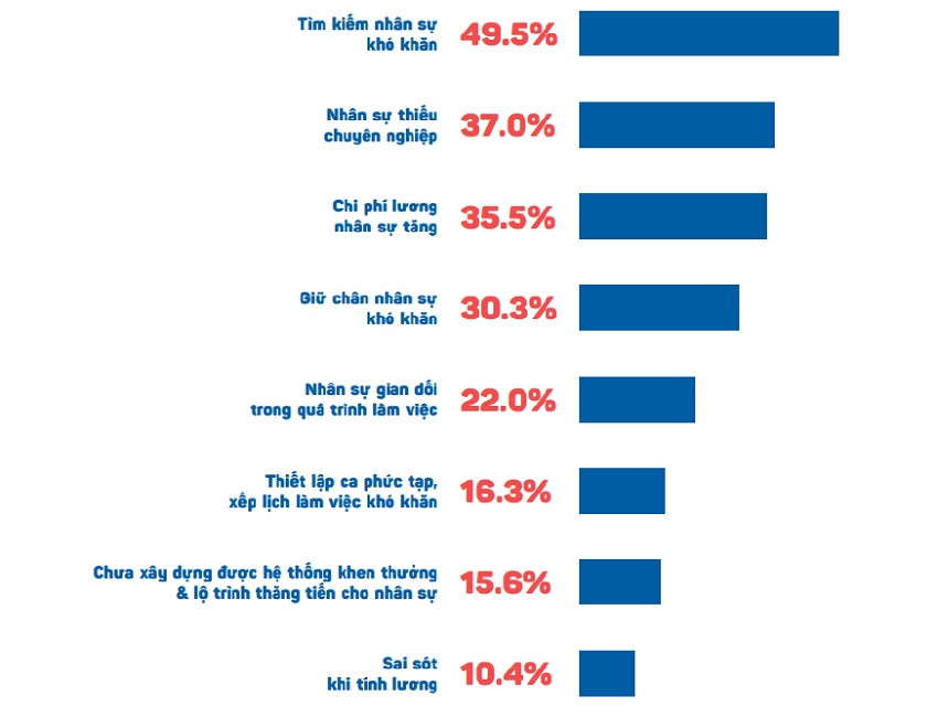 Dẫu vậy, đà tăng trưởng đi cùng lo ngại về nhân sự trong ngành. Theo iPOS, có tới 99,1% đơn vị kinh doanh F&B đang lo ngại về nhân sự. Cụ thể, 49,5% doanh nghiệp gặp khó trong tìm kiếm người; 37% doanh nghiệp lo ngại về nhân sự thiếu chuyên nghiệp…