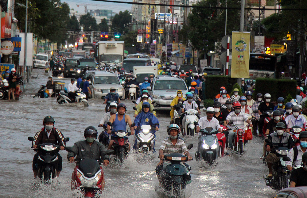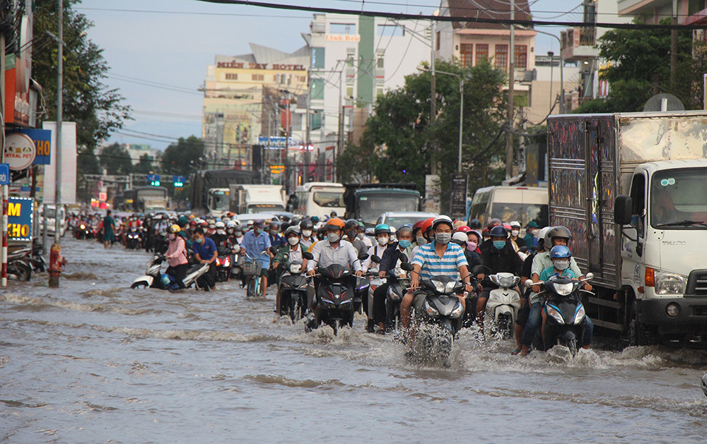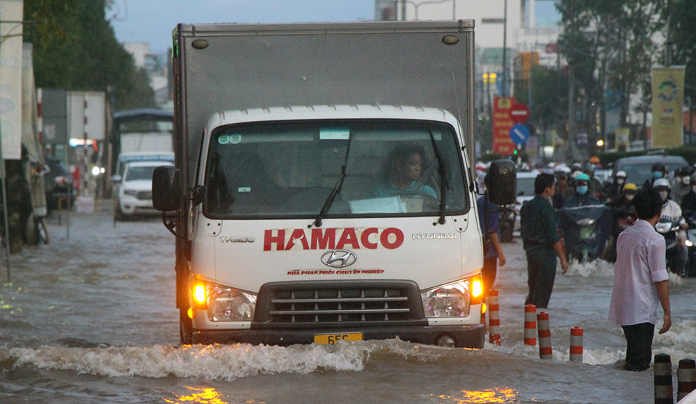 Tại đường Mậu Thân, nước từ sông dâng tràn lên đường. Chỉ khoảng 30 phút, cả con đường này mênh mông nước khi triều cường đạt đỉnh kết hợp cùng cơn mưa lớn. Nước ngập sâu khiến đoàn xe ùn ứ kéo dài khoảng 1km trên đường. Lực lượng công an, dân quân, thanh niên xung phong được huy động giúp xe người dân qua đường ngập.