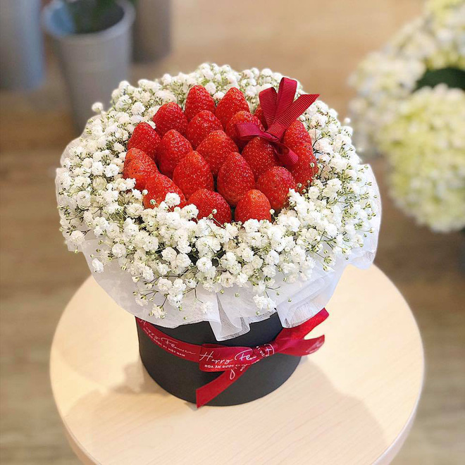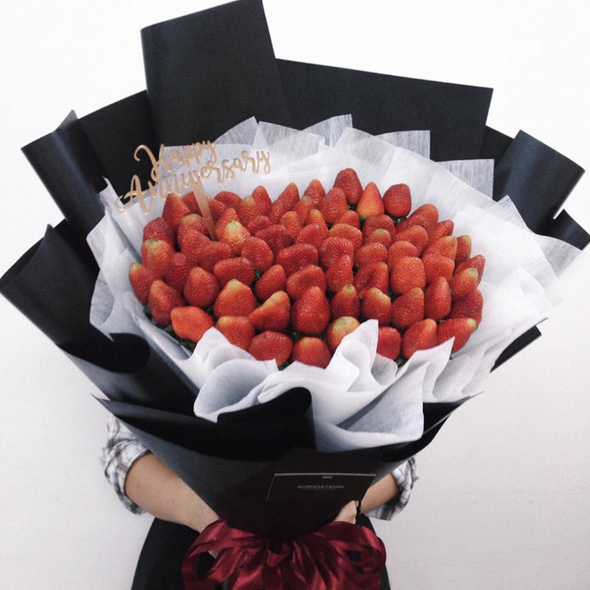 Dâu tây chắc hẳn là nguyên liệu đi đầu trào lưu của các "bó hoa ăn được". Dù đã xuất hiện trong vài năm gần đây nhưng những bó hoa từ dâu tây có lẽ vẫn chưa bao giờ hết "hot". Một bó đầy ắp dâu tây hay điểm xuyết chút hoa baby thì cũng đều "đốn tim" phái đẹp hết thôi.