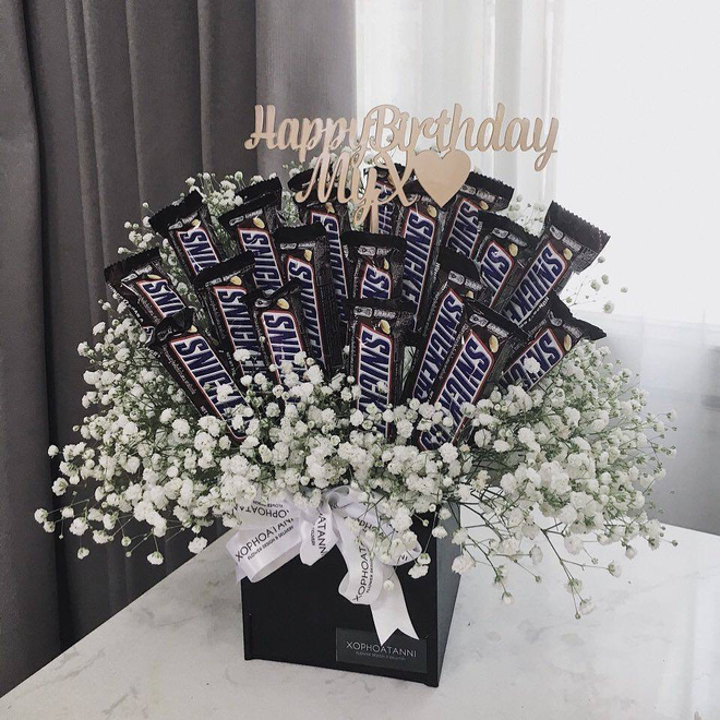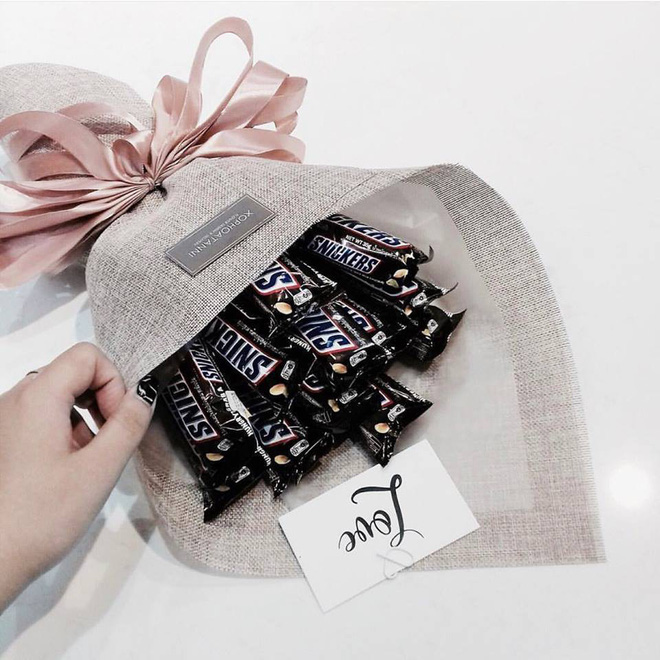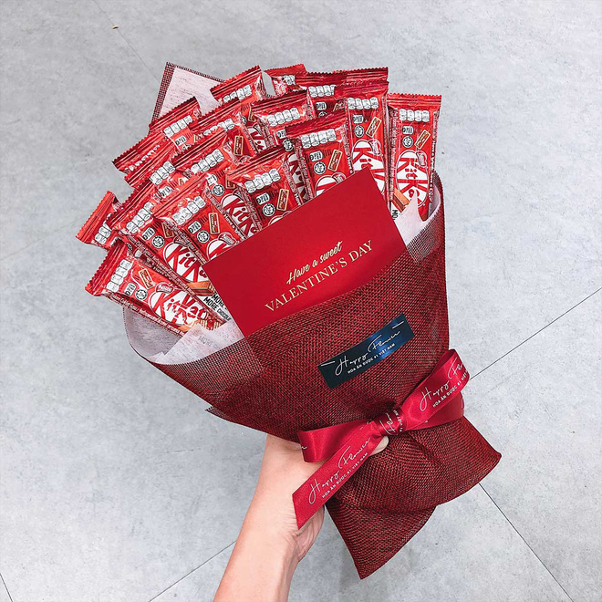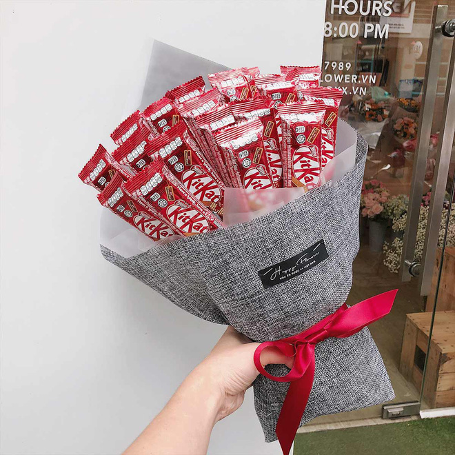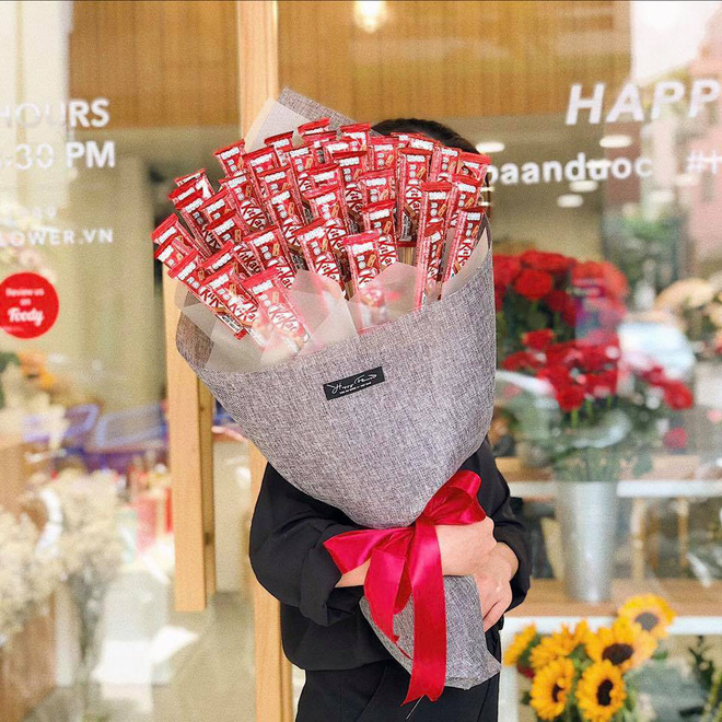 Một bó hoa đầy ắp kitkat thì sao nhỉ? Vừa đẹp lại còn ăn được ngay sau đó nữa chứ. Bên cạnh hai loại trà xanh và chocolate quen thuộc, nhiều shop hoa còn thêm cả những vị mới lạ như đậu phộng, cookies cream...