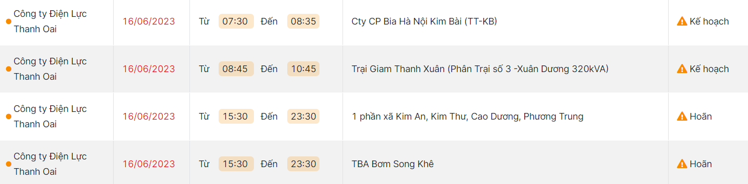 15:30 - 23:30: Một phần xã Kim An, Kim Thư, Cao Dương, Phương Trung, TBA Bơm Song Khê (hoãn)