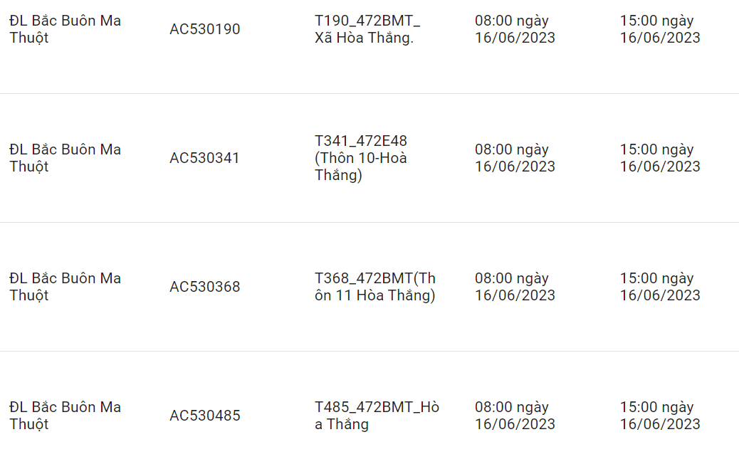 08:00 - 15:00: T188_472E48 công ty cà phê Việt Nam, T189 khu TT EaKmat, T190_472BMT_ xã Hòa Thắng, T341_472E48 (thôn 10, Hoà Thắng), T368_472BMT(thôn 11, Hòa Thắng), T485_472BMT_Hòa Thắng, T504_472BMT-Tân Hoà, T68_472E48, T70_472BMT-Viện KH NLN TN, T01-ĐMT.MB_472BMT_công ty MiBa (trạm KH), T300_472E48(TT Nghiên cứu Tây Nguyên) trạm KH, T443_472E48-Sư đoàn 375 Quân chủng phòng không (trạm KH), T457_472E48-Trần Bình, T461_472BMT_Viện Khoa học KT Nông Lâm Nghiệp TN (trạm KH)