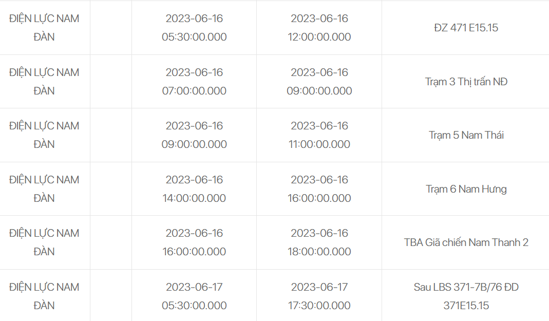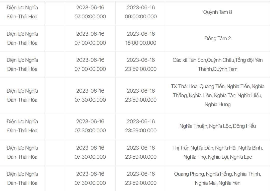 07:30 - 23:59: Thị xã Thái Hoà, xã Quang Tiến, Nghĩa Tiến, Nghĩa Thắng, Nghĩa Liên, Nghĩa Tân, Nghĩa Hiếu, Nghĩa Hưng, Nghĩa Thuận, Nghĩa Lộc, Đông Hiếu, thị trấn Nghĩa Đàn, Nghĩa Hội, Nghĩa Bình, Nghĩa Thọ, Nghĩa Lợi, Nghĩa Lạc, Quang Phong, Nghĩa Hồng, Nghĩa Thịnh, Nghĩa Mai, Nghĩa Yên, Nghĩa Trung, Nghĩa Bình, Đồng Tâm