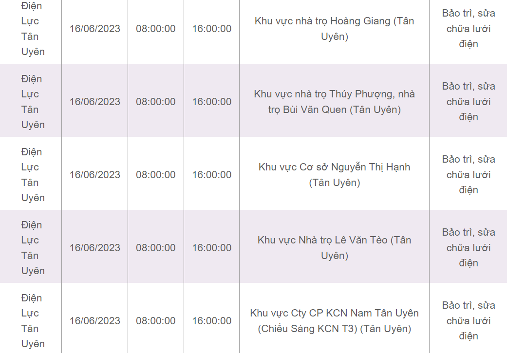 08:00 - 16:00: Khu vực 1x25kVA NN Hà Hữu Nghĩa, khu vực HKD Phan Văn Mạnh, khu vực cơ sở Nguyễn Đình, khu vực nhà trọ Hoàng Giang, khu vực nhà trọ Thúy Phượng, nhà trọ Bùi Văn Quen, khu vực cơ sở Nguyễn Thị Hạnh, khu vực nhà trọ Lê Văn Tèo, khu vực công ty CP KCN Nam Tân Uyên (Chiếu Sáng KCN T3), khu vực công ty CP Anh Linh