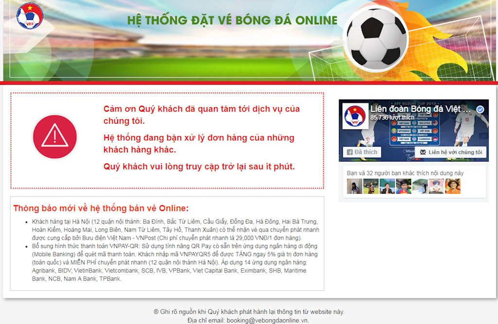 Theo thông báo từ VFF, hệ thống bán vé online trận bán kết lượt về giữa ĐT Việt Nam và ĐT Philippines tại AFF Suzuki Cup 2018 dự kiến mở bán trở lại lúc 10h00 hôm nay (29/11/2018). Từ tối qua đến sáng nay, trên các trang bán vé chính thức cũng xuất hiện thông báo: "Cảm ơn Quý khách đã sử dụng dịch vụ đặt vé online. Hiện tại hệ thống tạm ngưng để phục vụ hoạt động tra soát. Hệ thống dự kiến mở bán trở lại lúc 10h00 ngày 29/11/2018".