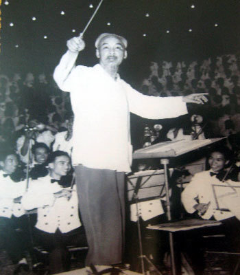 Bác Hồ chỉ huy dàn nhạc, hợp xướng và quần chúng nhân dân hát "Bài ca kết đoàn" tại công viên Bách Thảo, Hà Nội (năm 1960)