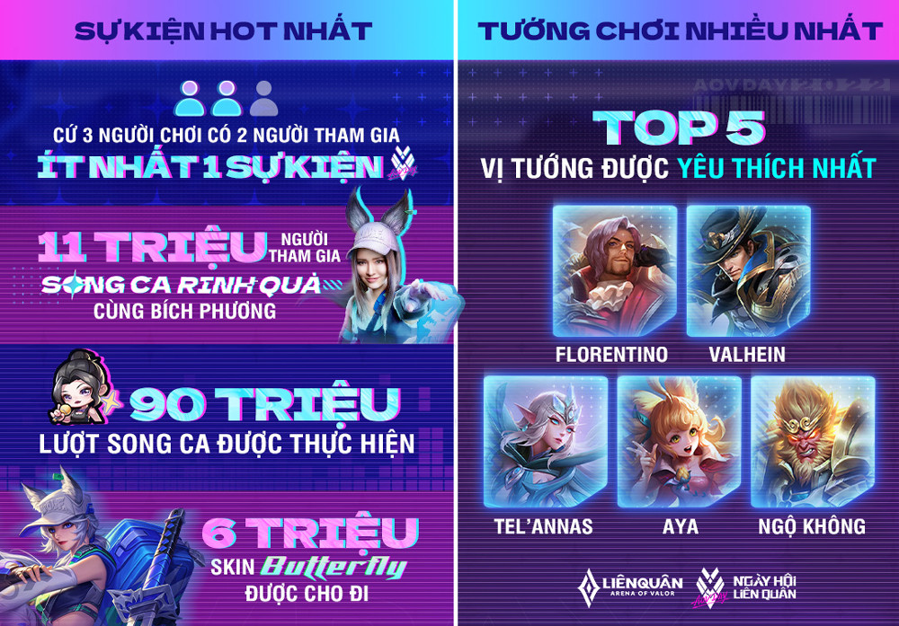 Là chuỗi sự kiện lớn nhất trong năm, “Ngày hội Liên Quân - Hè chill quà chất” mang tới người chơi một loạt hoạt động thú vị trong game như sự kiện “Song ca rinh quà”, mini-game “Đường đua âm nhạc”, sự kiện EDM Party, sự kiện “Sưu tầm tem nhận Skin Ilumia”. Sức hút của những hoạt động này đã được khẳng định khi trong suốt thời gian diễn ra, cứ 3 người chơi đăng nhập game sẽ có 2 người chơi tham gia ít nhất một hoạt động. Đặc biệt, phải nhắc đến hoạt động có sức hút lớn nhất, “Song ca rinh quà” với xấp xỉ 11 triệu người tham gia và 90 triệu lượt song ca được thực hiện trong suốt sự kiện.
