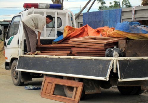 Tấm bạt được mở ra, những người ngồi trên xe đã bốc dỡ toàn bộ số gỗ thành phẩm trên và đưa vào căn biệt thự đang trong quá trình hoàn thiện.