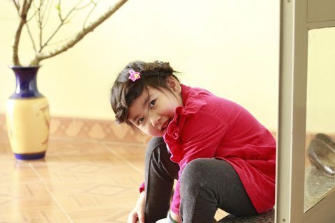 Bé đang mặc chiếc áo đẹp mẹ thêu hoa