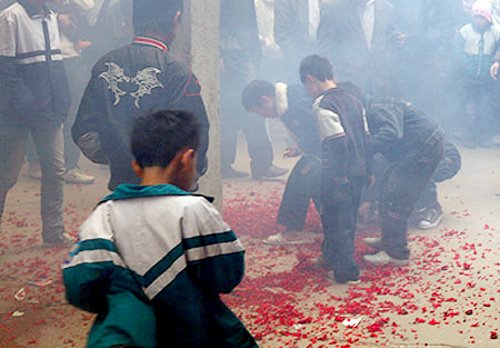 Trẻ em tranh nhau nhặt những quả pháo chưa nổ còn sót lại trong ngày Tết năm xưa. Ảnh: Internet |