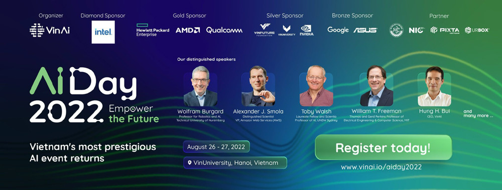 Diễn giả của AI Day 2022 là những nhà khoa học tiên phong đến từ các viện nghiên cứu, trường đại học và doanh nghiệp hàng đầu thế giới về AI như: GS. Wolfram Burgard (Khoa Robot và Trí tuệ nhân tạo, Đại học kỹ thuật Nuremberg, Đức); GS. Alexander J. Smola (Phó Chủ tịch Amazon Web Services - AWS); GS. William T. Freeman (Khoa Kỹ thuật điện & Khoa học máy tính, Viện Công nghệ Massachusetts - MIT, Mỹ); GS. Toby Walsh (Khoa Trí tuệ nhân tạo, Trường Đại học New South Wales Sydney, Úc); GS. Tiến sĩ Bùi Hải Hưng (Tổng giám đốc VinAI); TS. Nguyễn Văn Dương (Trưởng Bộ phận Hệ thống Hỗ trợ lái xe ADAS của Panasonic Automotive Europe); GS. Inderjit S. Dhillon (Khoa Toán và Khoa học máy tính, Trường Đại học Texas, Austin, Mỹ)...