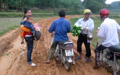 Do đường lầy lội nên nhiều bậc phụ huynh đành phải chấp nhận sáng cõng con lên lớp, chiều cõng con về nhà hàng. Chị Vương Thị Thắm, trú tại xóm 8, xã Tiên Kỳ bức nói: “Gần 3 tháng nay, ngày nào tui cũng cũng phải cõng con đi học. Đường sá thì làm tạm bợ, dân tình chúng tôi đã nghèo khổ, nay lại phải đi trên con đường sục bùn thì ai mà chịu được”.