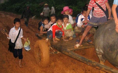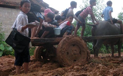 ![]() Từ tờ mờ sáng, hàng trăm học sinh nơi đây đến trường bằng xe bò đi trên con đường lấm lem bùn đất. Ảnh: Q.Huy |