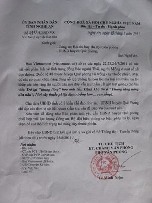 Công văn chỉ rõ: 'Trên báo VietNamNet các 22, 23, 24/7/2011 có các bài viết phản ánh về tình trạng đồng bào người Thái, người Mông ở một số xã dọc đường QL48 thuộc huyện Quế Phong tái trồng cây thuốc phiện.