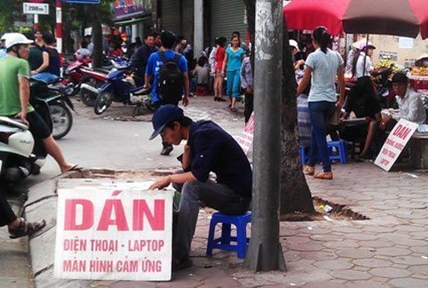 Đức Trọng (Sinh viên một trường đại học ở Hà Nội) kể, cậu bắt đầu công việc dán điện thoại trên vỉa hè từ hơn 1 năm nay. Trước khi bắt đầu kinh doanh, cậu đã bỏ ra 1 tháng để học kinh nghiệm từ một người đồng hương cũng làm dịch vụ này. Theo Trọng, công việc này không vất vả,nhưng đòi hỏi sự tỉ mỉ, cẩn trọng.