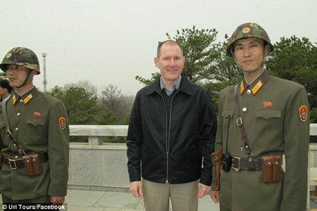 Một du khách Mỹ tỏ ra rất vui vẻ khi chụp ảnh với các quân nhân Triều Tiên. |
