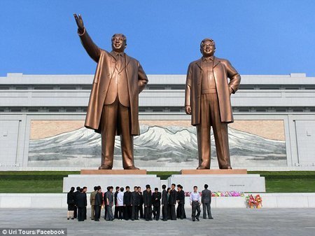 Các du khách nước ngoài được yêu cầu cúi đầu khi đứng trước tượng đài hai nhà lãnh đạo quá cố. |