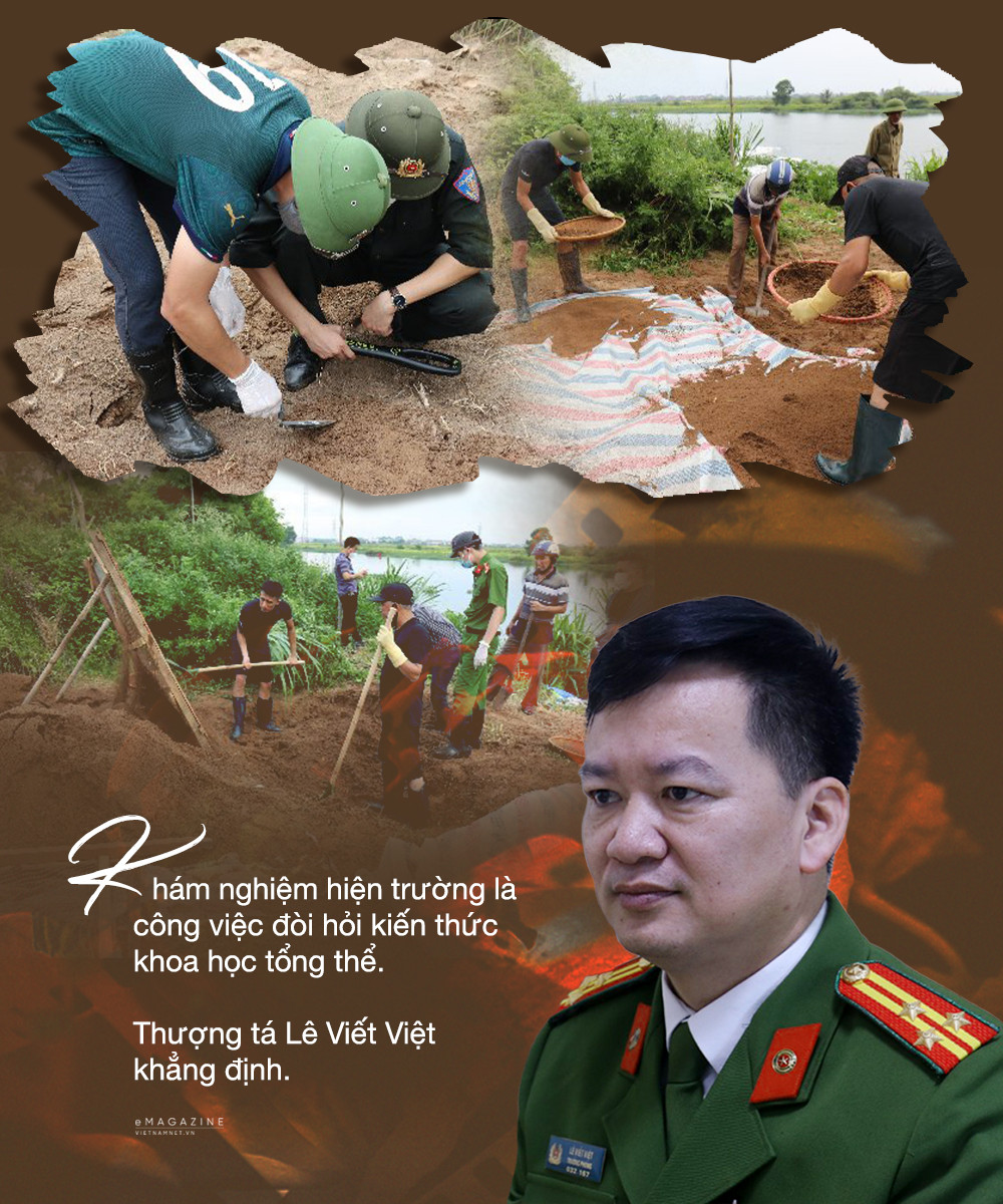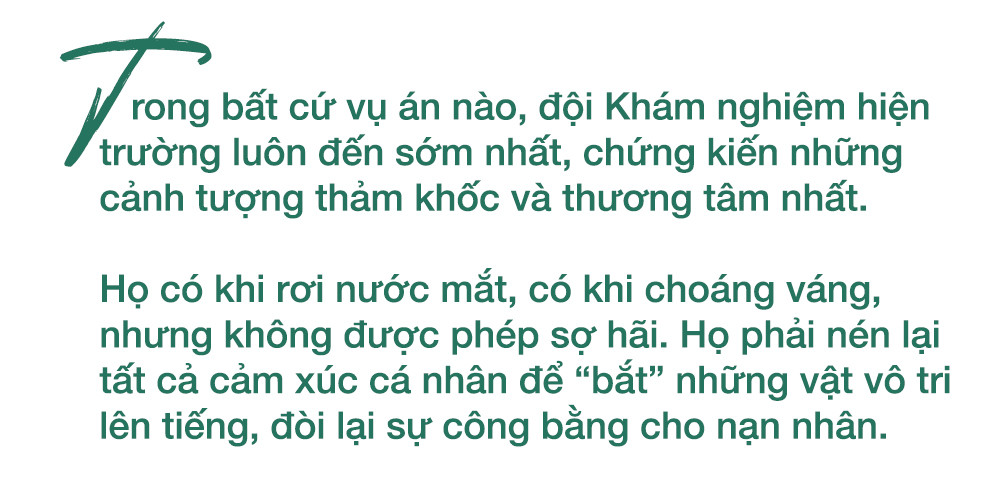 “Khám nghiệm hiện trường là công việc đòi hỏi kiến thức khoa học tổng thể. Vì thế, phòng của chúng tôi có một lực lượng tổng hợp, bao gồm cả giám định viên cơ học, giám định viên súng đạn, giám định viên đường vân, giám định viên sinh học, hoá học… Khi cần, chúng tôi phải trưng dụng thêm chuyên gia của các phòng, các lĩnh vực khác” - Thượng tá Việt nói.
