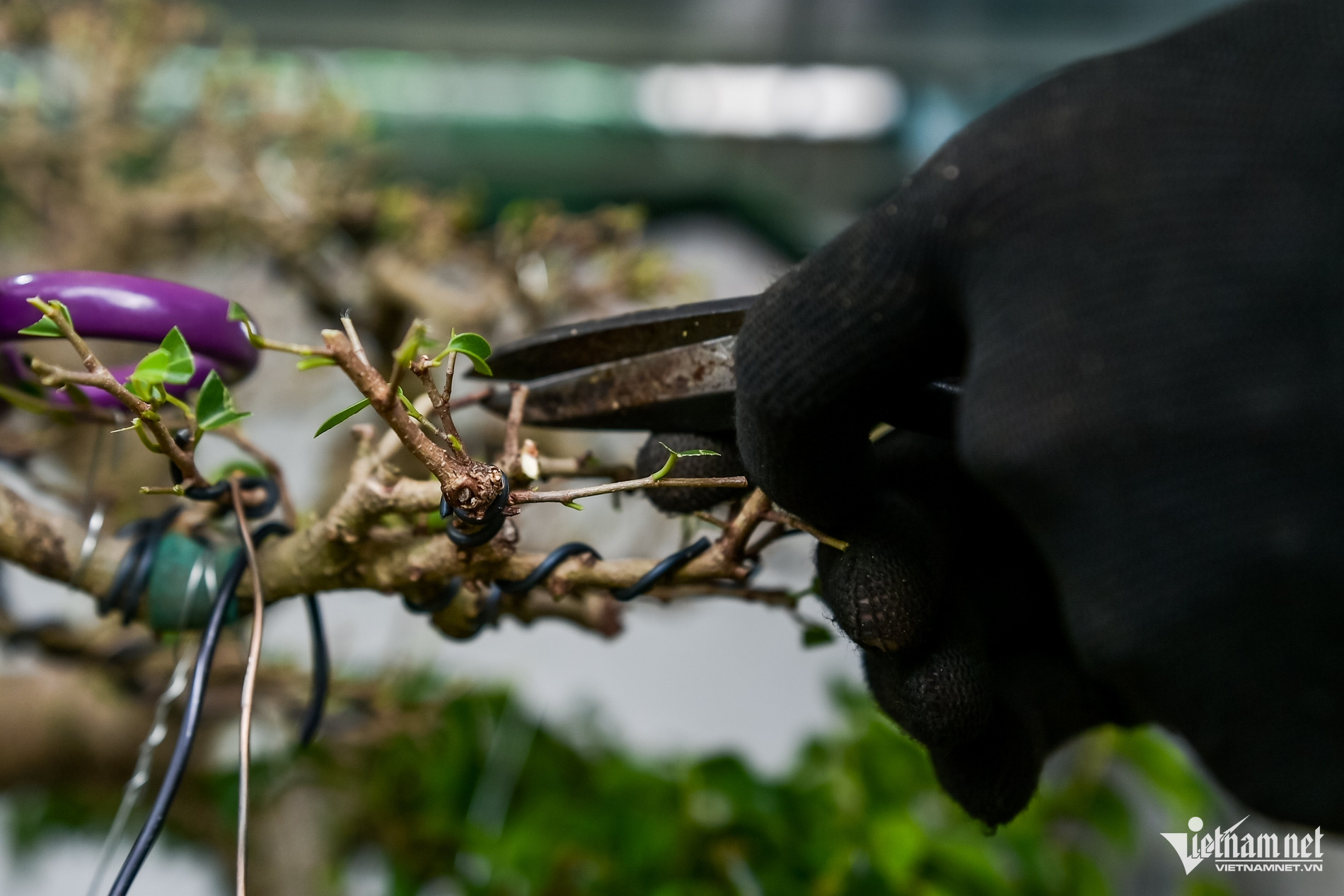 Với 18 năm trong nghề uốn tỉa cây cảnh, anh Phạm Tuấn Anh (35 tuổi, trú tại phường Vị Khê), cho hay, để tạo tác một tác phẩm cây cảnh, người thợ thường bắt đầu từ việc tỉa hết lá để lộ phần xương, sau đó dùng nhôm uốn định hình.