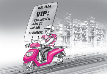 Trên một trang rao vặt, có thông tin: “Mình là TK, hành nghề chạy xe ôm chuyên chở các anh chị em có nhu cầu đi lại. Thời gian hoạt động 24/24 giờ, giá cả như sau: 60.000 đồng/giờ, bao cả ngày là 200.000 đồng. Ai có nhu cầu thì gọi 016538…”. Theo nhiều tài xế xe ôm “VIP”, giá cả mỗi cuốc xe chỉ nằm giữa khung giá dịch vụ xe ôm bình thường và giá taxi.