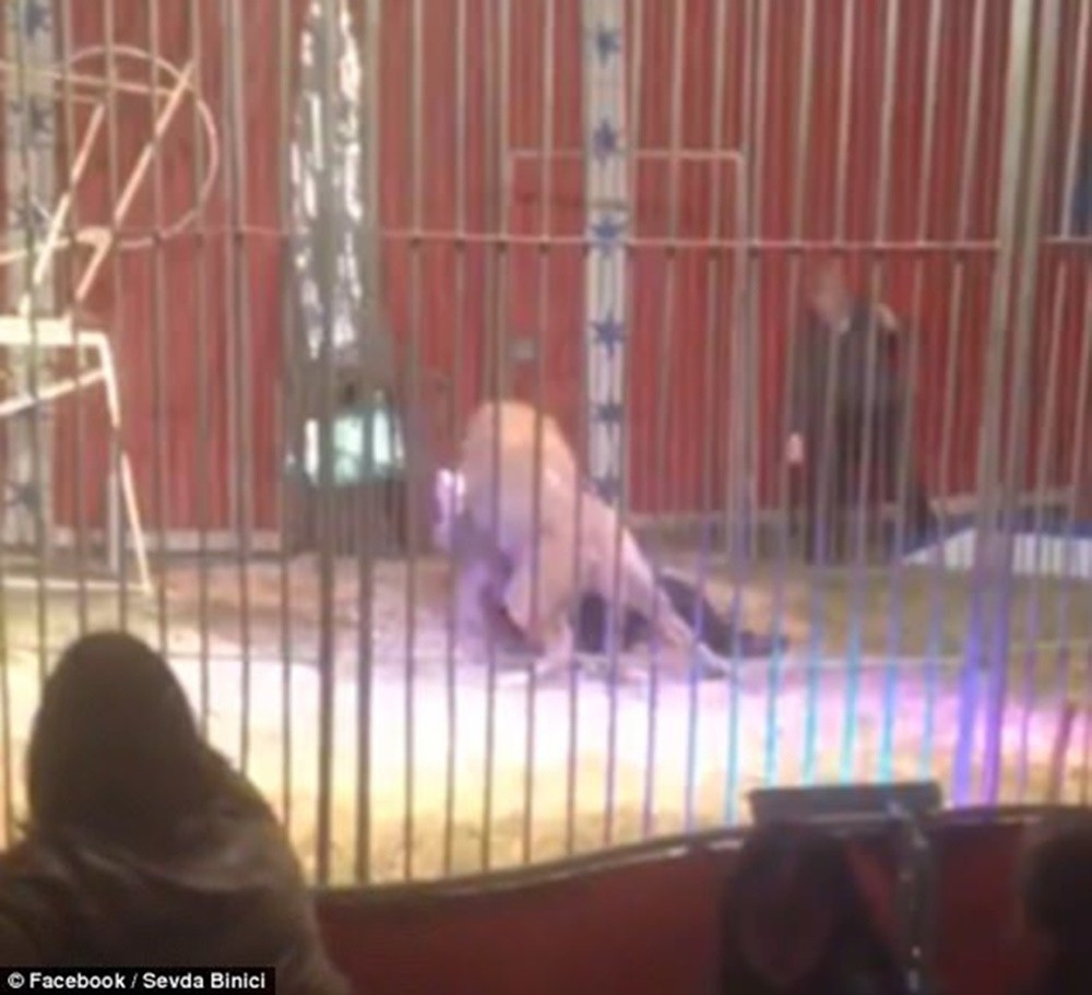 Con sư tử liên tục quăng quật nam huấn luyện viên trong tiếng la hét của khán giả, cho đến khi vợ anh dùng bình cứu hỏa xịt khắp sân khấu để đánh lạc hướng.