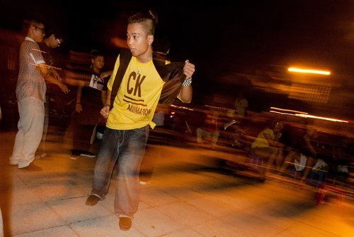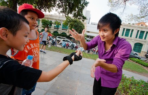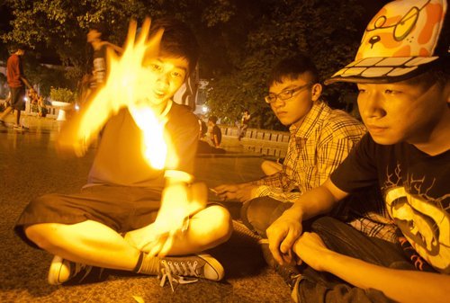 Một thành viên của nhóm Minishock biểu diễn ảo thuật đường phố vào mỗi tối dưới tượng đài vua Lý Thái Tổ (Ảnh: TT)