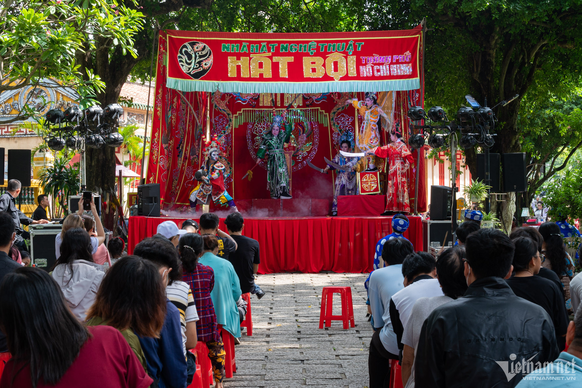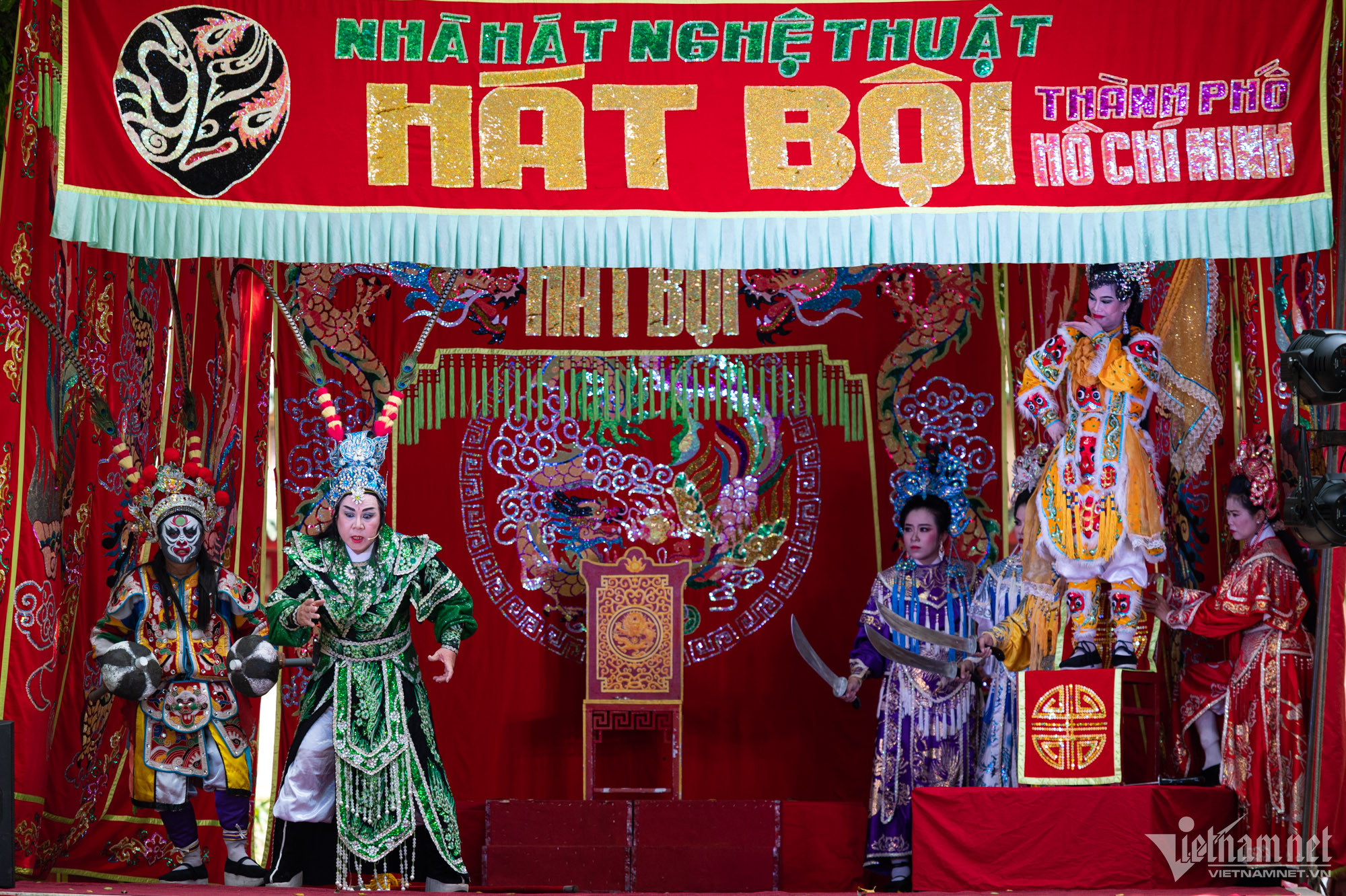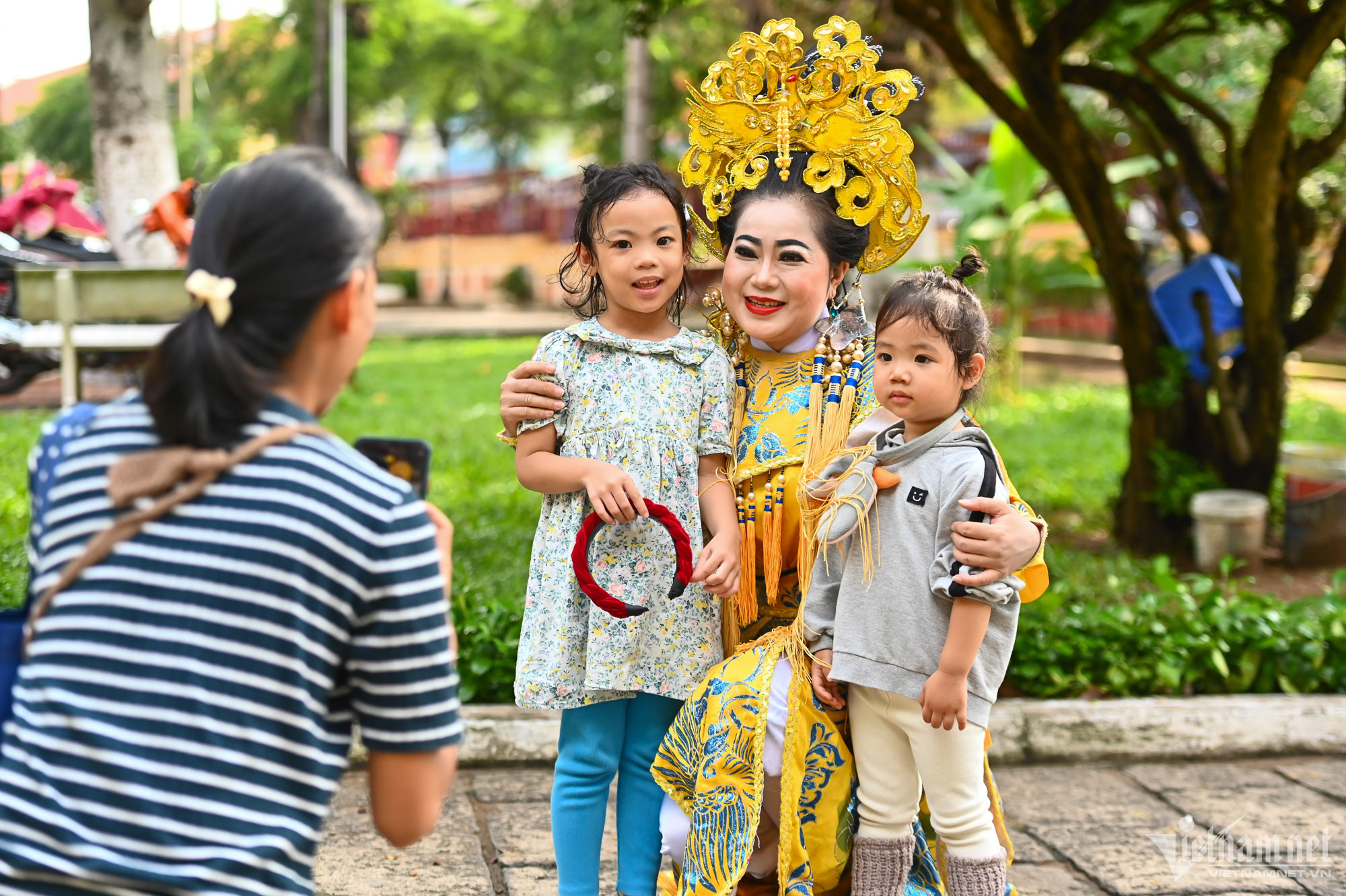 Kết thúc buổi diễn, nhiều khán giả nán lại để giao lưu với các nghệ sĩ trong bộ phục trang ấn tượng. Được mẹ cho đi xem rất nhiều buổi biểu diễn hát bội, hai bạn nhỏ này vẫn luôn tỏ ra thích thú khi được chụp ảnh cùng các bà, các cô vừa ở trên sân khấu đi xuống.