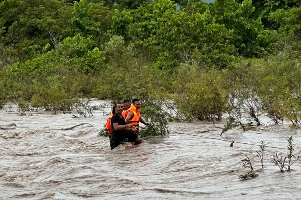 Lực lượng chức năng đã sử dụng áo phao, dây thừng cùng với thanh niên trong làng ra giữa dòng lũ để cứu 2 em nhỏ, đưa vào bờ an toàn, sau hơn 1 giờ nỗ lực cứu hộ cứu nạn giữa trời mưa và nước chảy xiết.