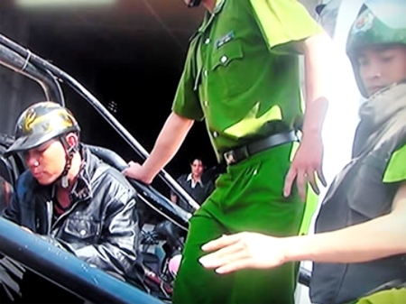 | Lực lượng chức năng đưa Thành lên xe về trụ sở. |