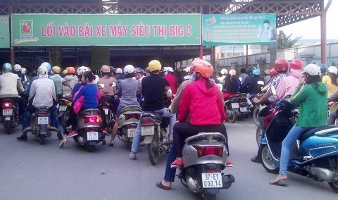 Ngay đường vào siêu thị cũng đã bị tắc. Dòng người nhích từng bước chậm chạm.