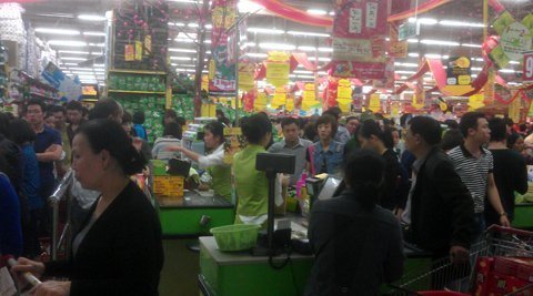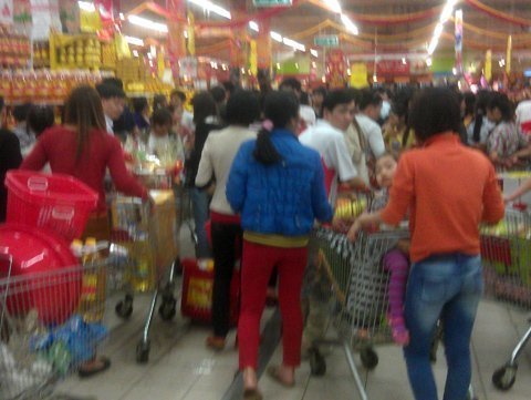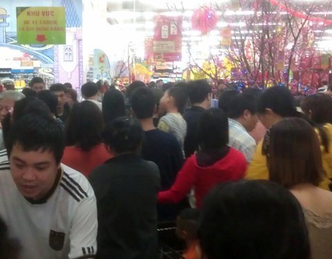 Tại hầu hết các siêu thị lớn đều có cảnh chờ hàng dài gửi xe, tranh nhau xe đẩy hàng và tắc nghẽn thanh toán. Người tỏ ra hồ hởi khi sắm được đồ, còn người thì thất vọng đi về vì mệt mỏi.