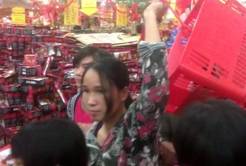 Mỗi người một xe đẩy khiến cho các lối đi của siêu thị đều chật cứng.