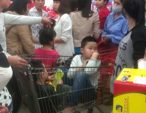 Không có người trông, nhiều trẻ con phải theo bố mẹ đi siêu thị. Giữa biển người, không ít các bé tỏ ra mệt mỏi.