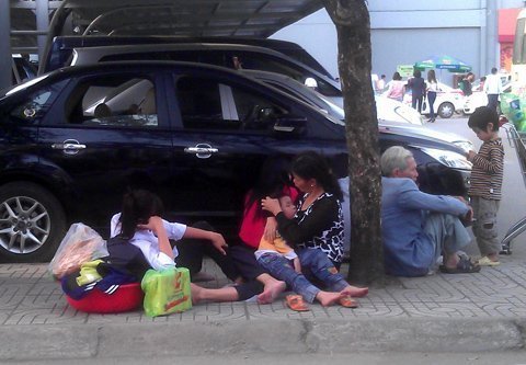 Mệt mỏi gia đình này đã phải dựa gốc cây để nghỉ, cháu bé đã sốt vì nóng quá.