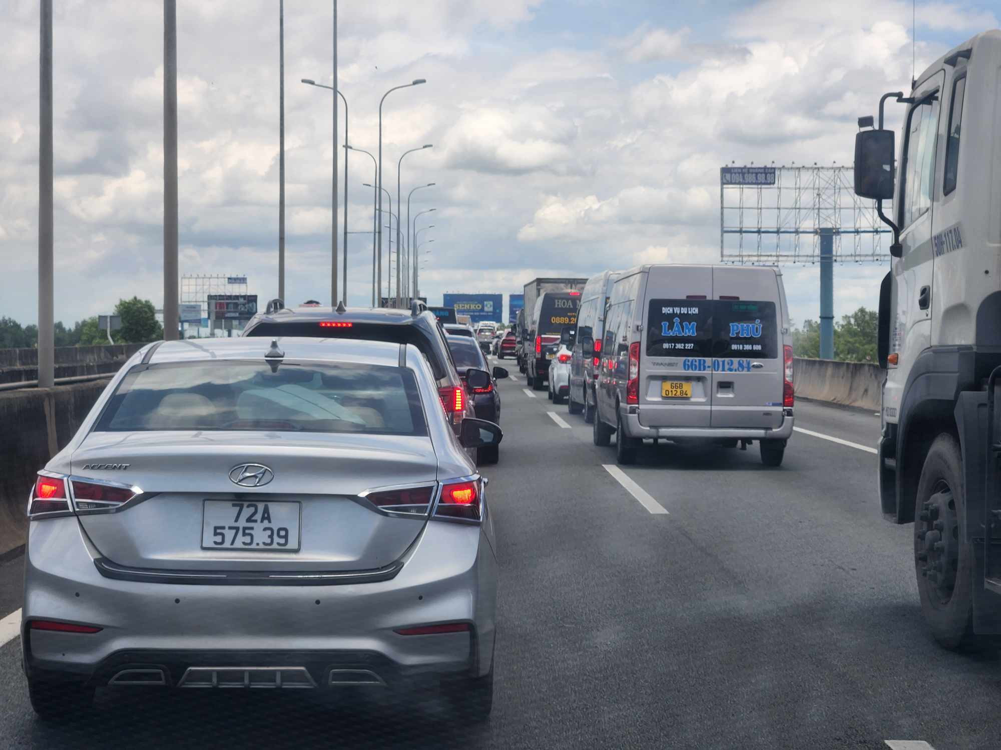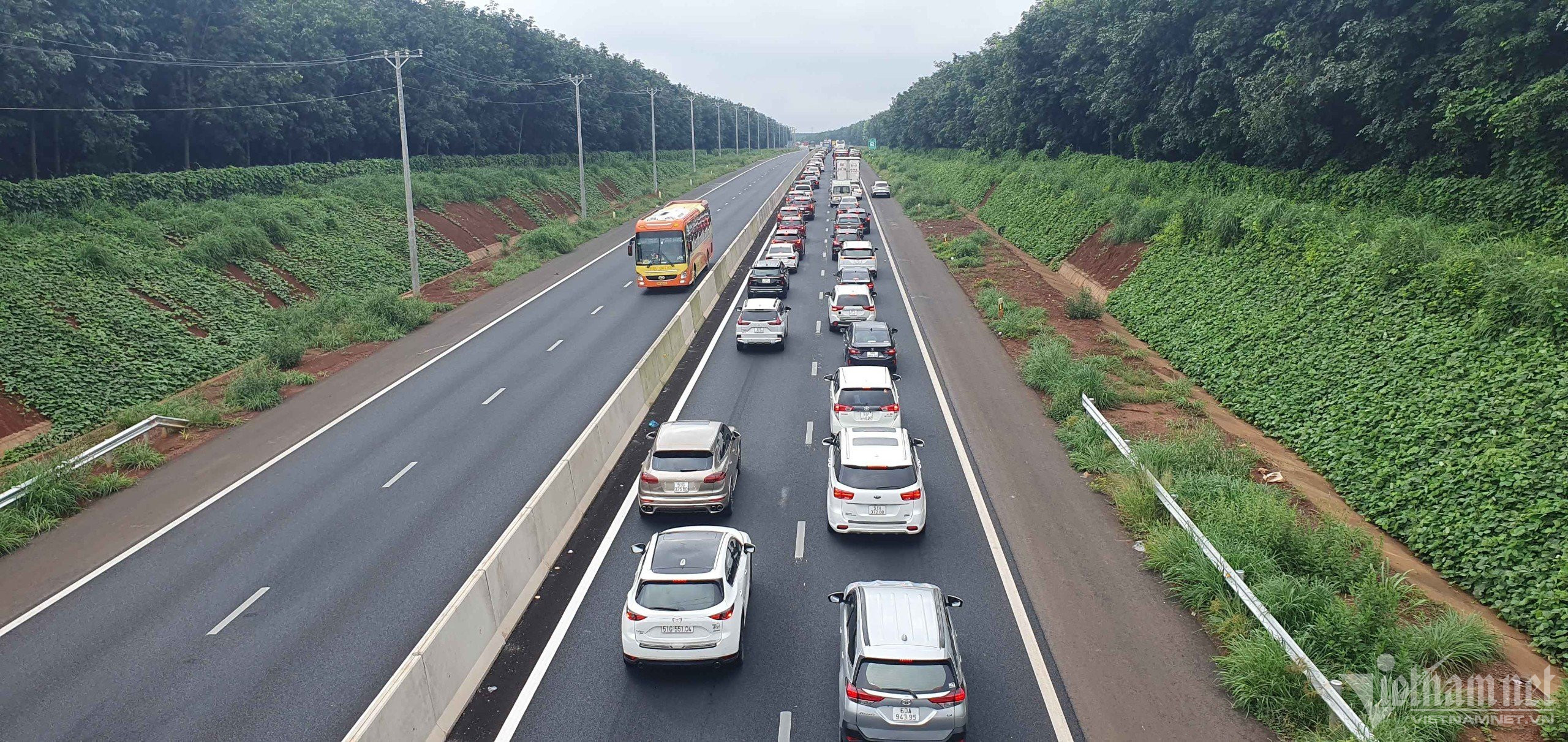 Cao tốc Phan Thiết - Dầu Giây, đoạn qua huyện Cẩm Mỹ, Đồng Nai, trạm thu phí 2 làn tạo “nút thắt cổ chai” gây ra tình trạng quá tải.Dòng xe kẹt dài hàng cây số qua huyện Cẩm Mỹ, Đồng Nai.Đoạn qua khu vực nút giao An Phú- đường dẫn cao tốc TP.HCM- Long Thành- Dầu Giây (TP Thủ Đức) ô tô nối dài nhích từng mét.Hướng An Phú (TP Thủ Đức) đi Long Thành (Đồng Nai) ùn xe kéo dài. Càng vào sâu bên trong cao tốc theo hướng về trạm thu phí Long Phước, tình trạng ùn ứ càng nghiêm trọng, ô tô xếp hàng dài, di chuyển rất khó khăn. Trong ảnh, ô tô nối đuôi nhau di chuyển qua nút giao Vành đai 2 (TP Thủ Đức) theo hướng đi Long Thành. Trong khi đó, theo hướng ngược lại giao thông thông thoáng. Ô tô xếp hàng dài nhích từng mét trên cao tốc TP.HCM- Long Thành- Dầu Giây đoạn cách trạm thu phí Phước Long khoảng 3km.Trước đó, Công ty Cổ phần Dịch vụ Kỹ thuật cao tốc Việt Nam (VEC E) đưa ra khuyến cáo, kêu gọi người dân chọn lộ trình thích hợp để né tránh cao tốc TP.HCM- Long Thành- Dầu Giây trong dịp nghỉ lễ 2/9 do lo ngại ùn tắc xảy ra.VEC E cho biết, kể từ khi cao tốc Phan Thiết- Dầu Giây đưa vào hoạt động, lượng phương tiện chọn lộ trình lưu thông qua tuyến cao tốc TP.HCM- Long Thành- Dầu Giây tăng cao. Đơn vị ghi nhận trung bình hiện nay khoảng 58.000 - 62.000 lượt xe/ngày đêm, cao điểm lễ đạt 70.000- 73.000 lượt xe.Chung tình cảnh, tuyến cao tốc Phan Thiết - Dầu Giây, đoạn qua Km 96 thuộc địa bàn xã Sông Nhạn, huyện Cẩm Mỹ, Đồng Nai cũng ùn tắc kéo dài. Đoàn xe hướng từ cao tốc TP.HCM - Long Thành - Dầu Giây ùn ùn đổ vào cao tốc Phan Thiết - Dầu Giây khiến nơi đây quá tải trầm trọng.Theo ghi nhận, dòng xe kéo dài khoảng 2km từ đoạn giao nhau giữa 2 cao tốc đến trạm thu phí đặt trên cao tốc Phan Thiết - Dầu Giây.Càng về trưa, lượng xe đổ về càng đông, xếp hàng dài và phải nhích từng mét rất khó khăn. Trong khi đó, tại trạm dừng chờ đầu tuyến cao tốc cũng rơi vào tình trạng quá tải.