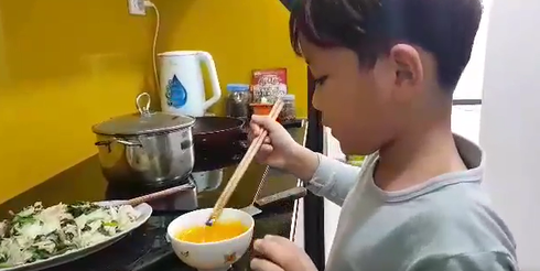 | Bạn Bốp (con trai anh Quốc Triều) tự vào bếp với món trứng rán. |