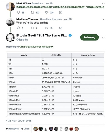 Nếu băm này thực sự là “băm vanity”, hay nói cách khác, được tạo ra một cách cố tình như một loại dấu hiệu, sức mạnh tính toán để tạo ra nó không chỉ lớn hơn khả năng của máy tính trung bình, mà thời gian cần thiết tạo ra nó có phần hơi bất ngờ, theo như tính toán trong một biểu đồ được đăng bởi nhà phát triển Andrew DeSantis.