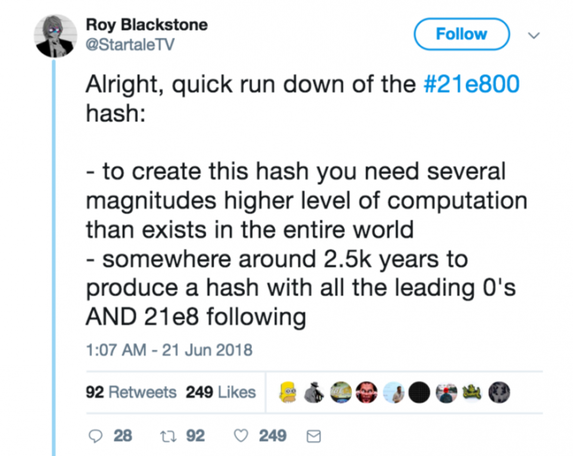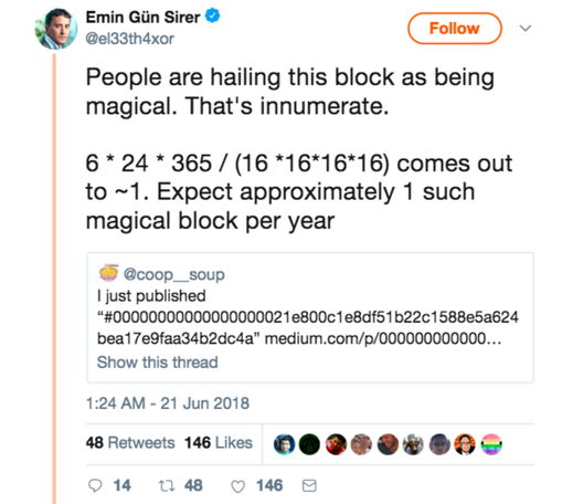 Theo như giáo sư đại học Cornell và nhà nghiên cứu blockchain Emin Gün Sirer giải thích, chuỗi ký tự “21e8” không “ảo diệu” đến thế và thực sự xảy ra khoảng mỗi năm một lần.