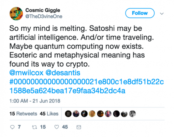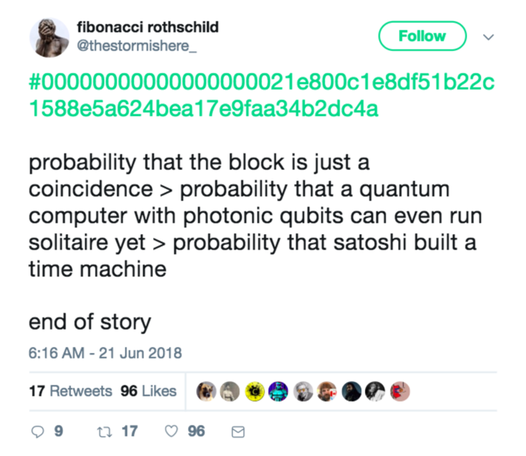 Điều rõ ràng từ cuộc trò chuyện phím trên mạng xã hội trong ngày là bí ẩn đằng sau giá trị băm này gắn liền với một điều huyền bí – và niềm đam mê – về Satoshi Nakamoto và câu chuyện sáng tạo ra Bitcoin.