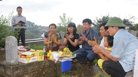 | Gia đình các liệt sĩ thắp hương bên phần mộ vừa tìm được. |