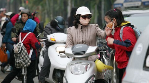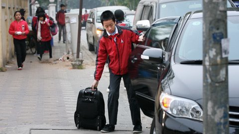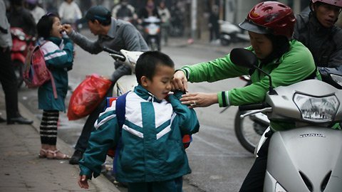 Giống như không ít học sinh ở các thành phố, cậu học sinh Trường THCS Marie Curie (Hà Nội) này vẫn đến trường trên chiếc ô tô ấm áp của gia đình.