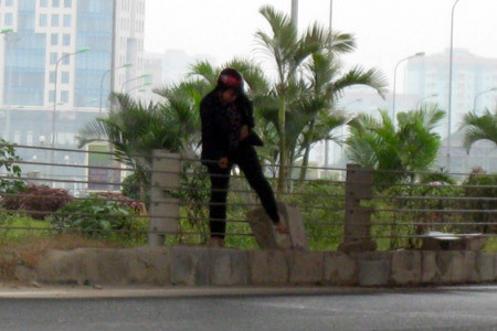 | Thậm chí có người còn trèo lên hàng dây phân cách qua đường |