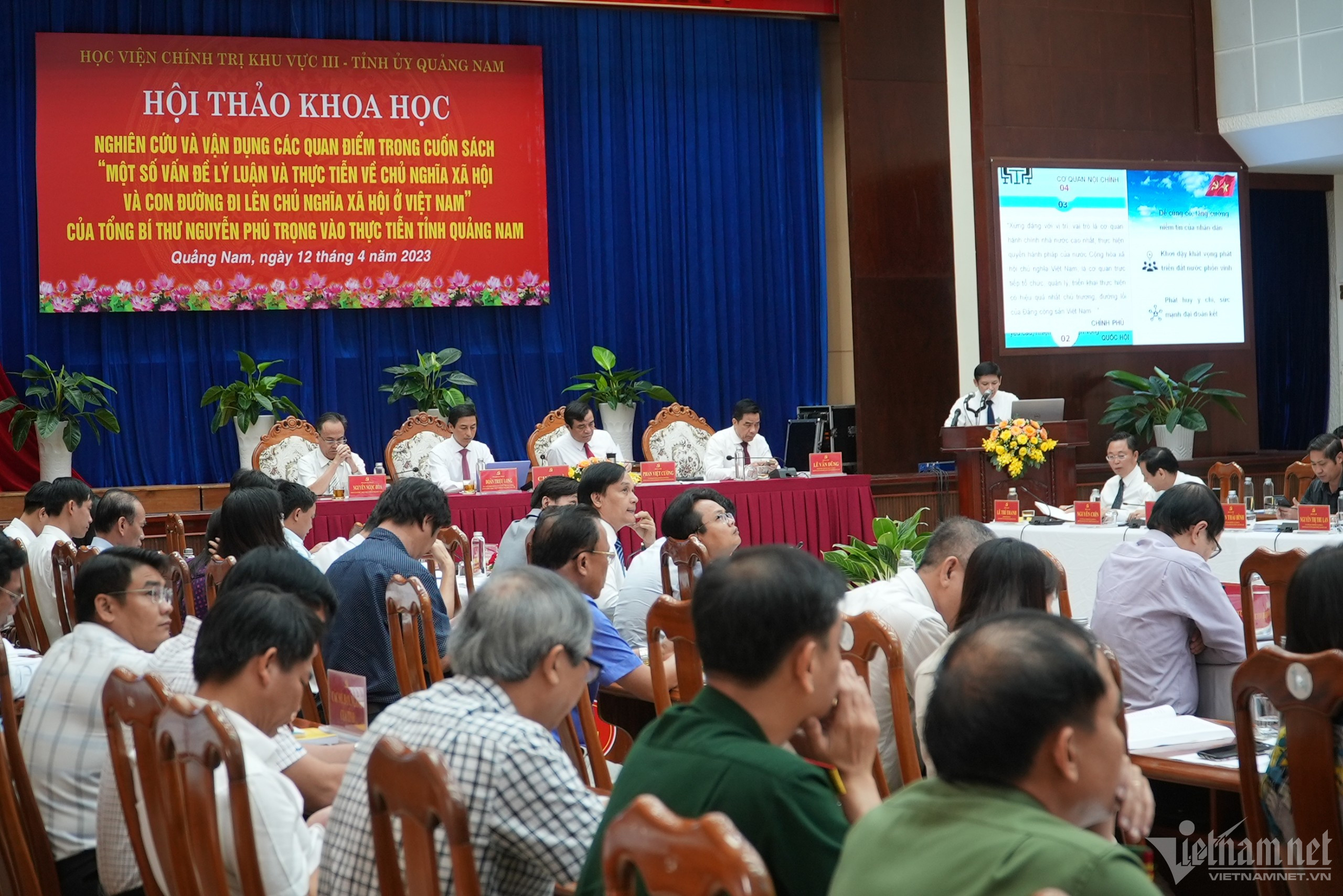 Hôm nay, trong không khí vui tươi, phấn khởi chào mừng kỷ niệm 48 năm ngày giải phóng hoàn toàn miền Nam, thống nhất đất nước; Ban Thường vụ Tỉnh ủy Quảng Nam phối hợp với Học viện Chính trị khu vực III tổ chức Hội thảo khoa học “Nghiên cứu và vận dụng các quan điểm trong cuốn sách “Một số vấn đề lý luận và thực tiễn về chủ nghĩa xã hội và con đường đi lên chủ nghĩa xã hội ở Việt Nam” của Tổng Bí thư Nguyễn Phú Trọng vào thực tiễn tỉnh Quảng Nam”. Đây là dịp để Quảng Nam nghiên cứu, luận giải những giá trị khoa học và tính thời sự trong cuốn sách của Tổng Bí thư Nguyễn Phú Trọng; từ đó, vận dụng xây dựng luận cứ khoa học nhằm hoạch định chủ trương, đề ra nhiệm vụ, giải pháp đột phá để phát triển tỉnh Quảng Nam trong thời gian đến.