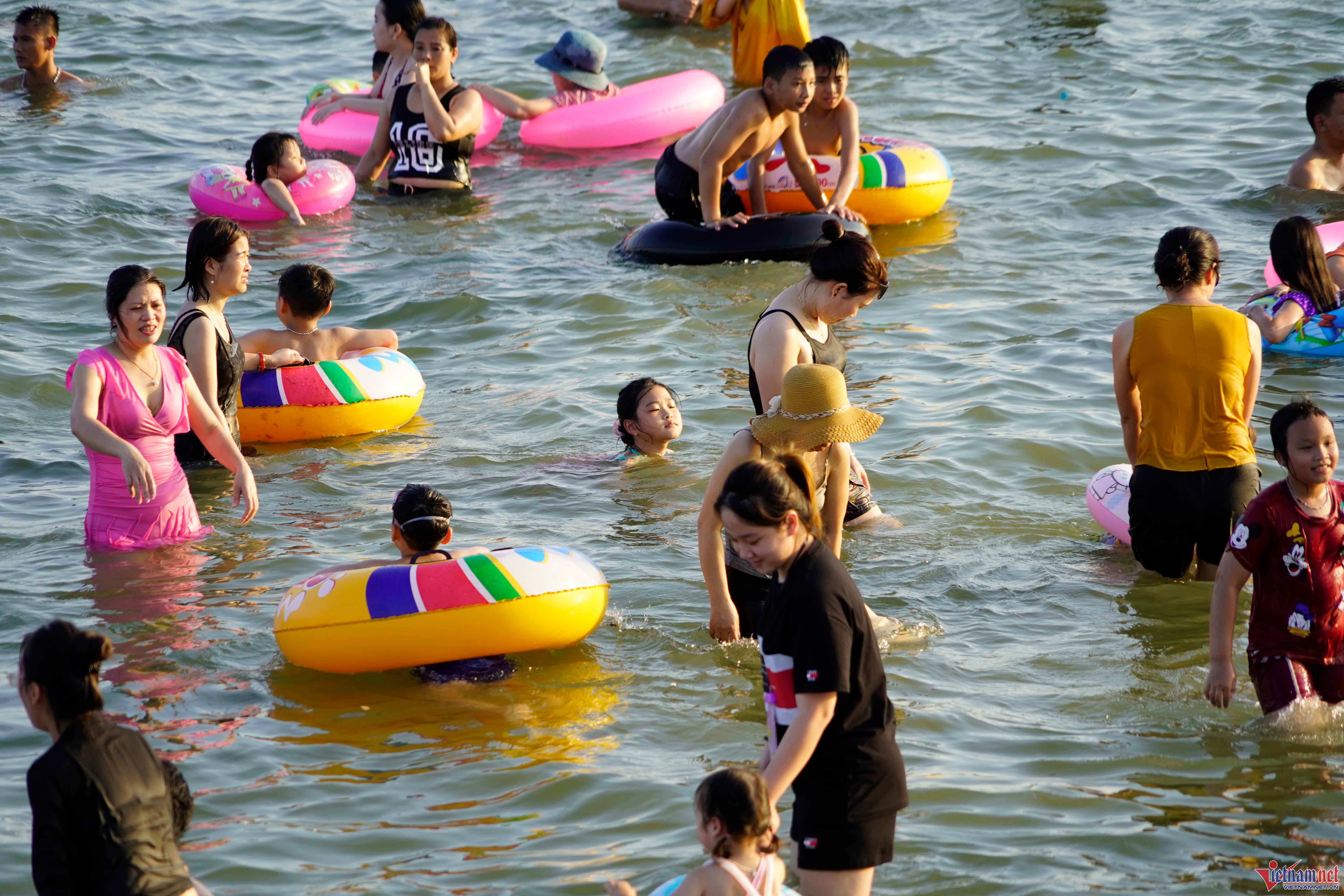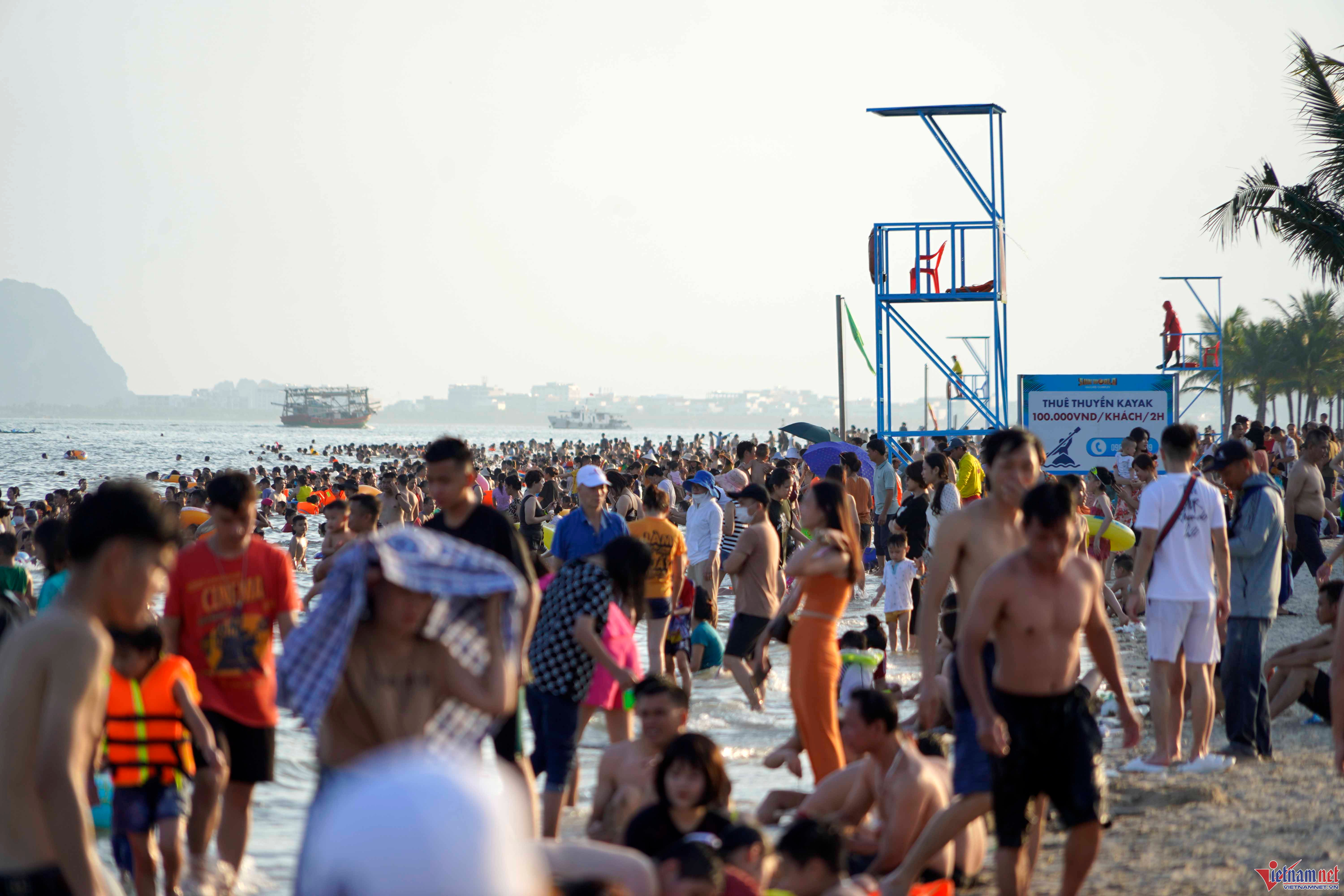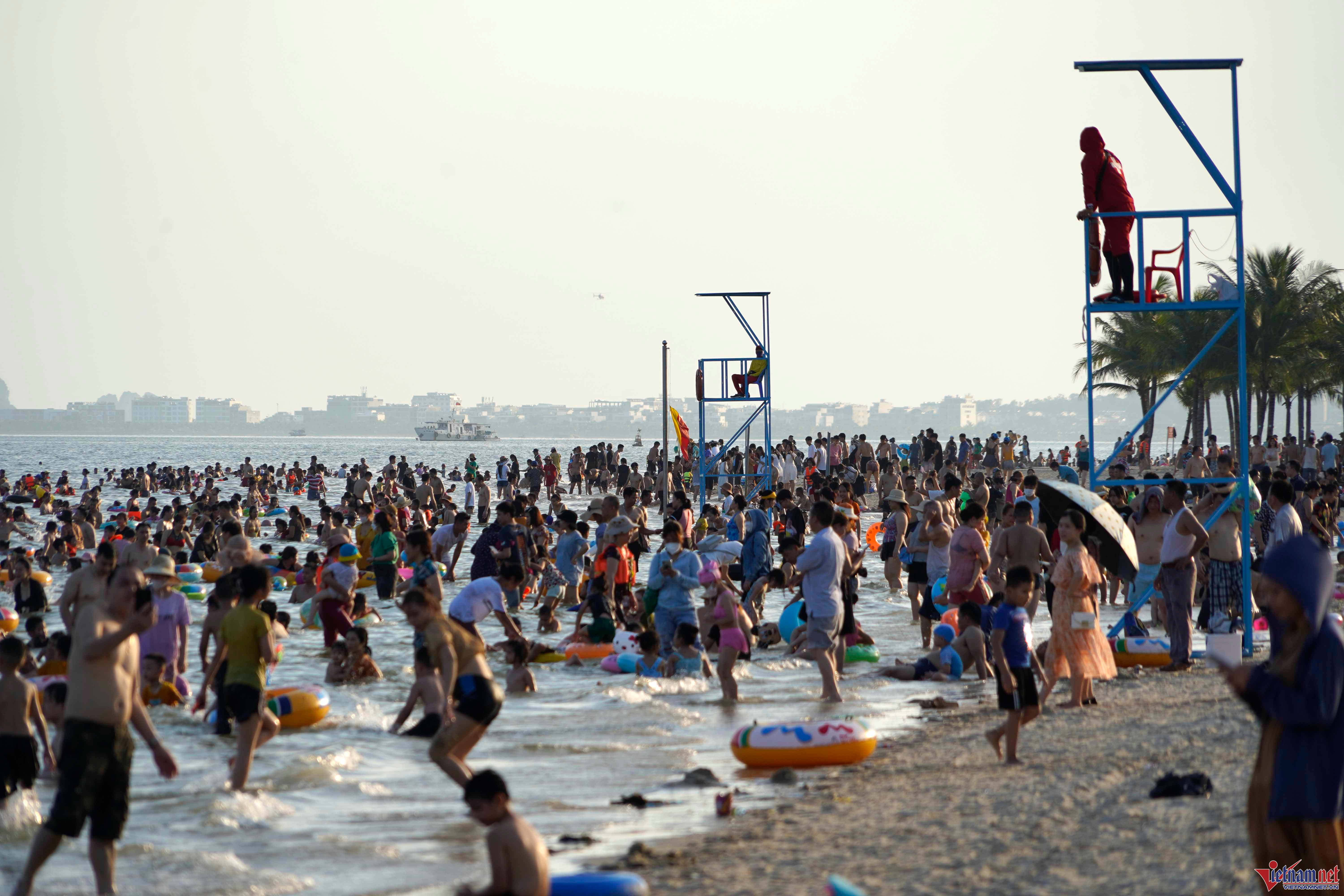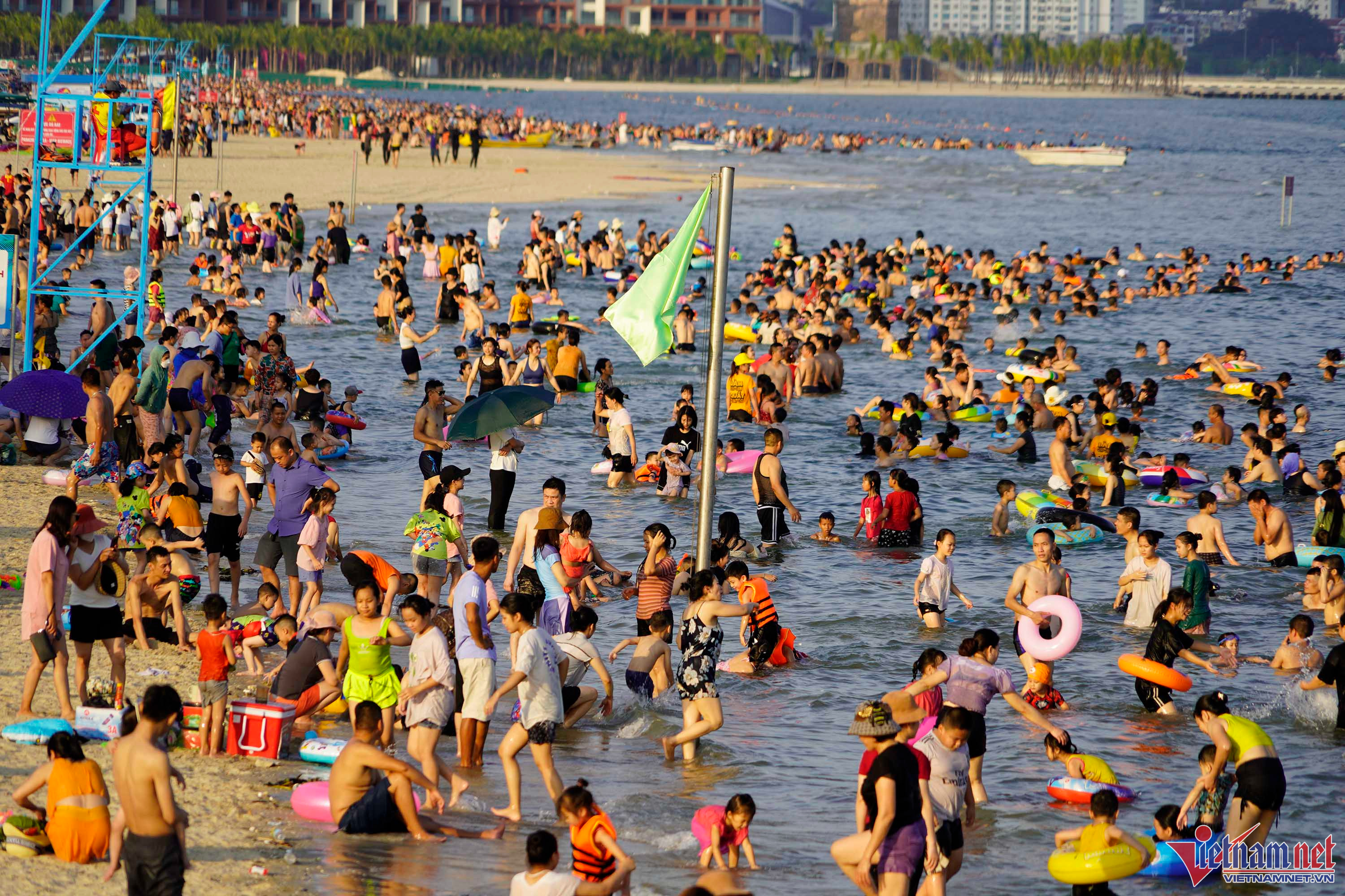 Dọc bãi biển Bãi Cháy là cảnh chen chân, chia nhau từng mét vuông mặt nước để tắm biển.