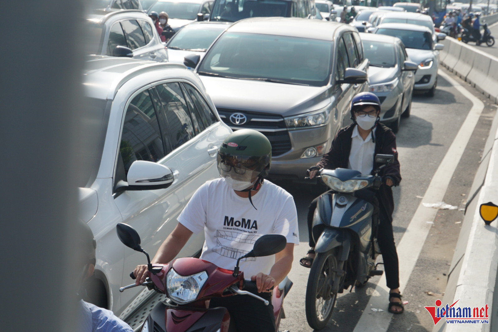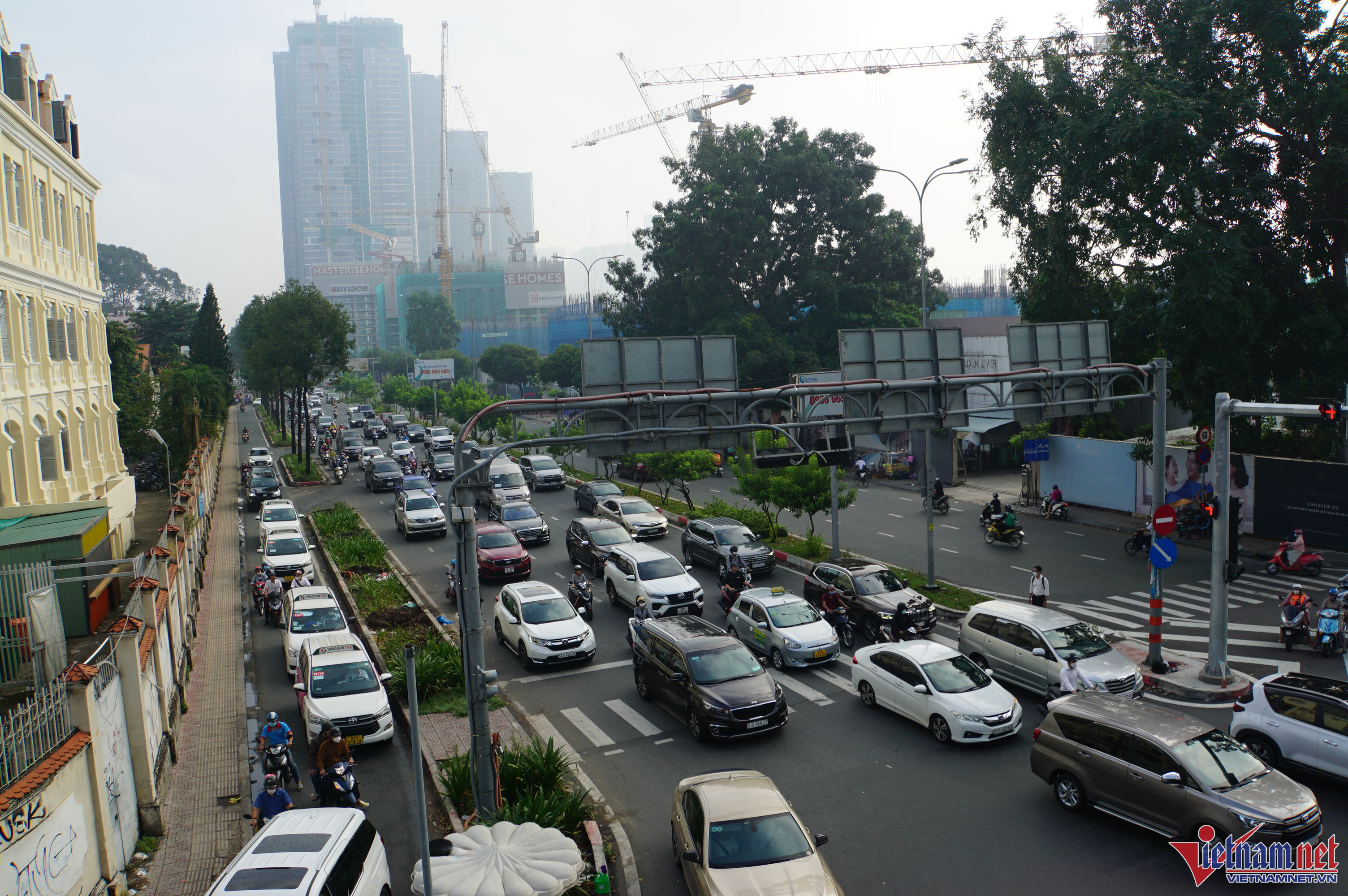 Kẹt nặng nhất là đoạn đường dưới chân cầu Thủ Thiêm 2, đoạn Lê Duẩn hướng từ Nguyễn Bỉnh Khiêm về nhà thờ Đức Bà, phương tiện gần như "đứng im bất động" trong thời gian dài.