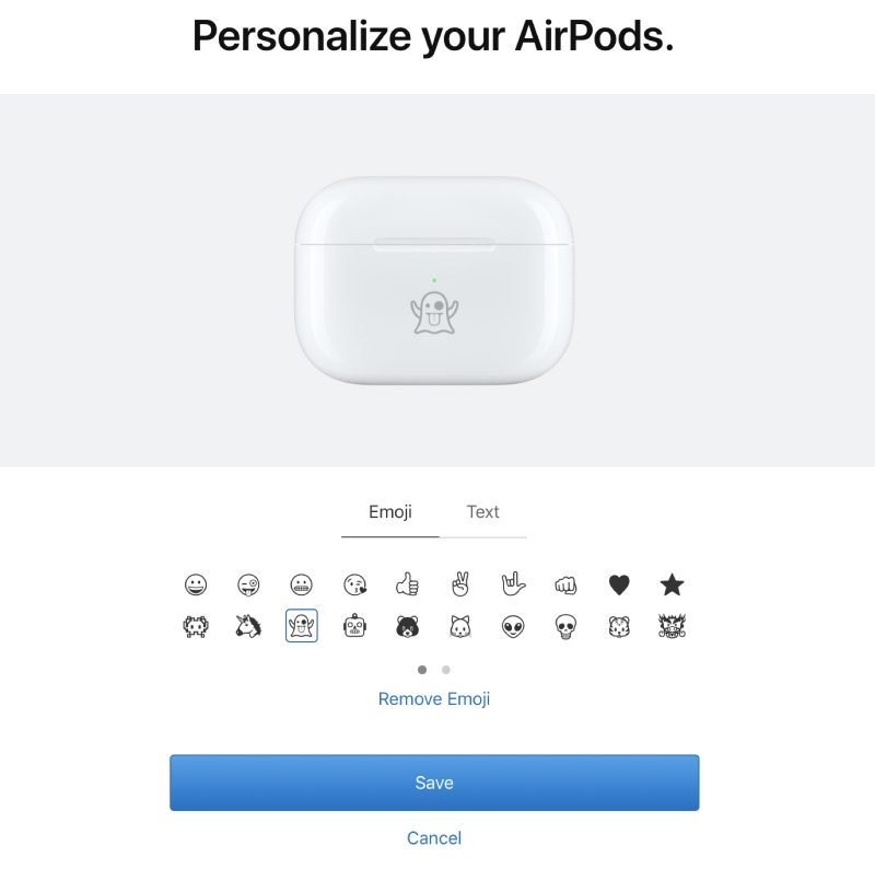 Khách hàng chọn cá nhân hóa AirPods trong quá trình mua sắm có thể chọn từ một số emoji có sẵn. Không phải emoji nào cũng có mặt. Apple chỉ cho chọn một số biểu tượng phổ biến như mặt cười, lè lưỡi, ngón tay cái hay các con vật như ngựa, chó, mèo, hổ…