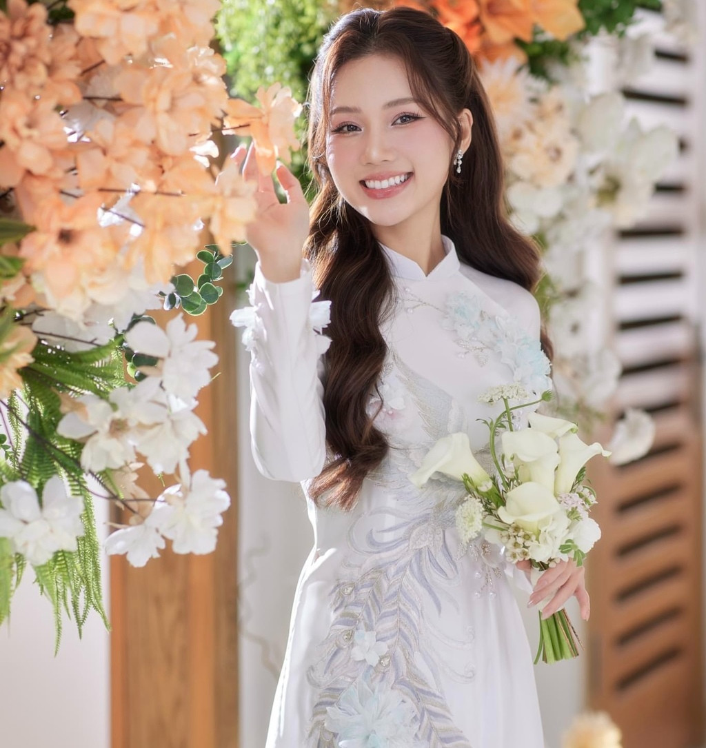 Trong ngày trọng đại, Ngọc Anh 'Phố trong làng' nền nã với tà áo dài trắng. Cô trang điểm nhẹ nhàng, trong trẻo nhưng vẫn toát lên thần thái rạng ngời.