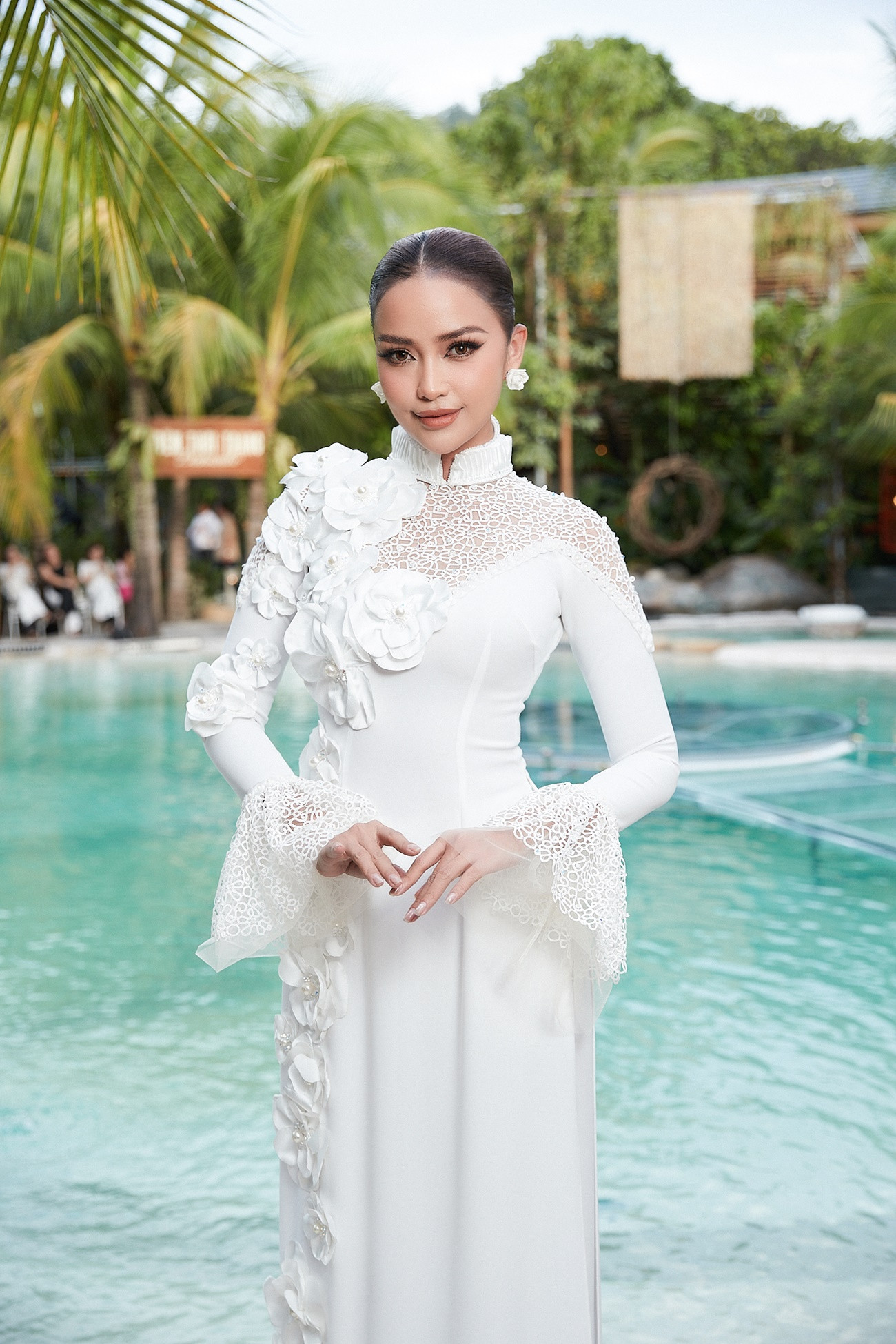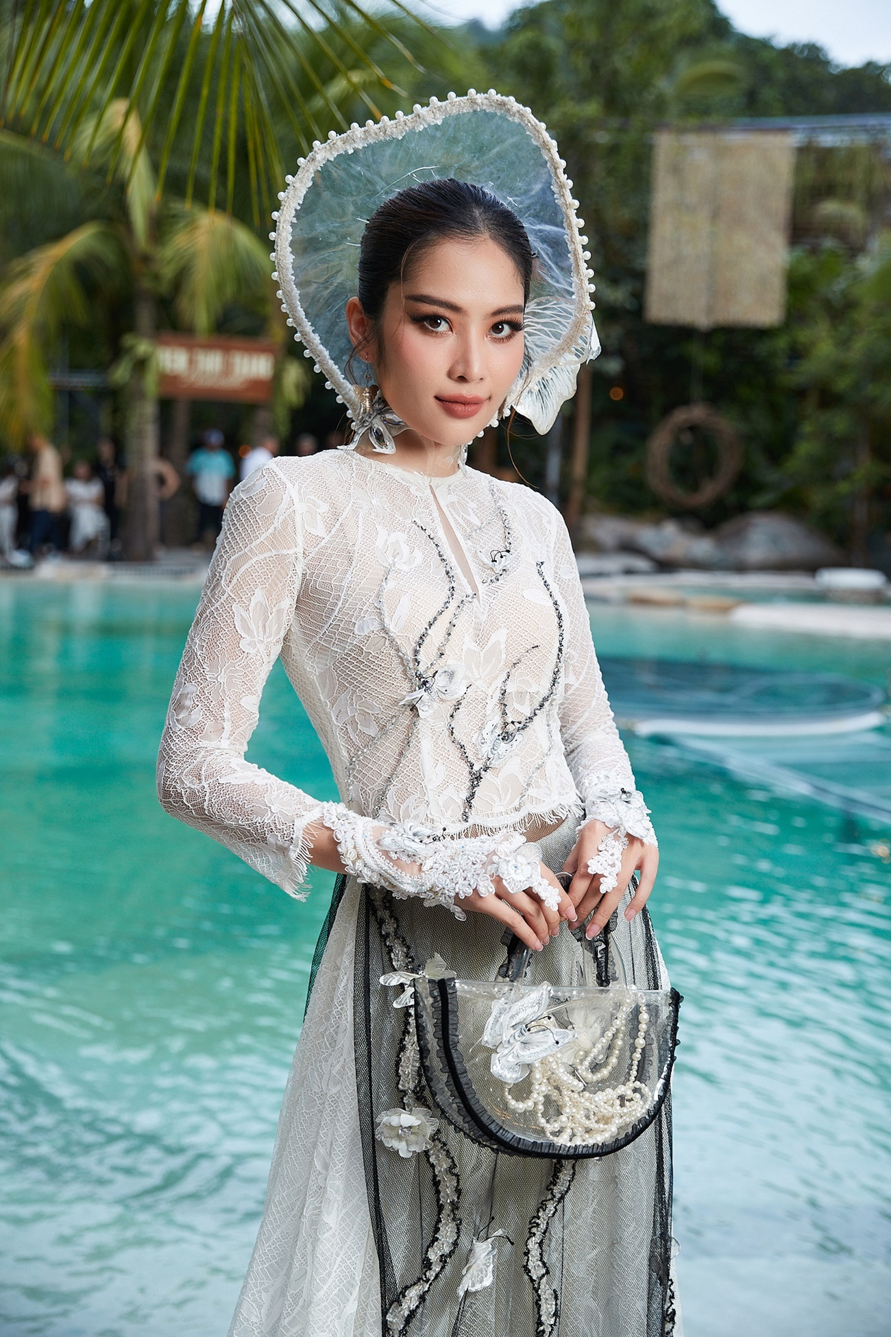 Chiều 1/8, tại Quy Nhơn, nhiều hoa hậu, á hậu góp mặt trên thảm đỏ show thời trang 'Trăng là...' của NTK Đinh Văn Thơ. Hoa hậu Hoàn vũ Việt Nam 2022 Ngọc Châu chọn áo dài trắng thướt tha với phần tay áo cách điệu, tà áo sử dụng kỹ thuật kết hoa tinh xảo.