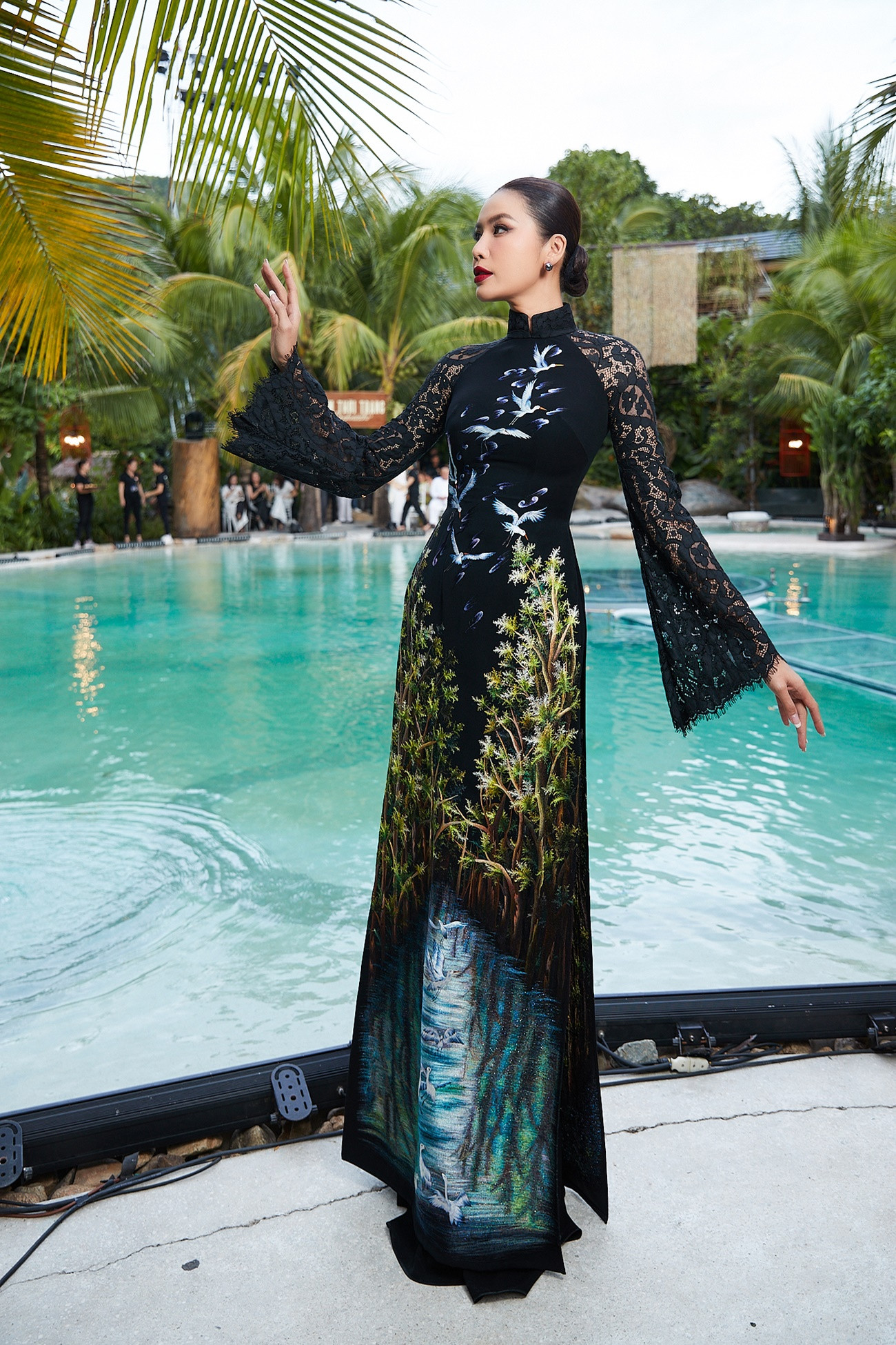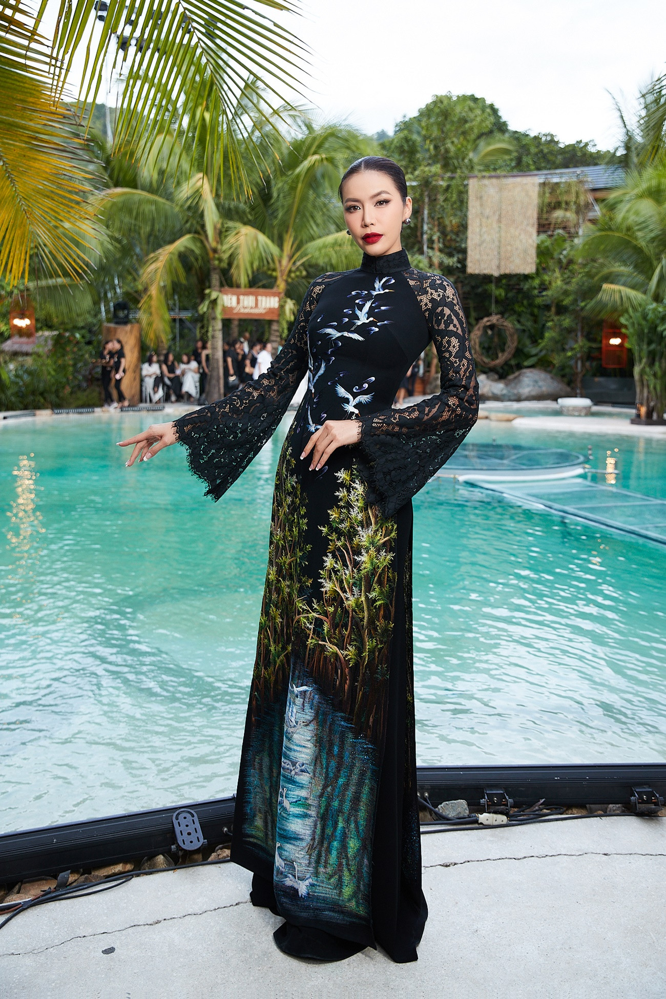 Siêu mẫu Minh Tú diện thiết kế màu đen phối ren cùng hoạ tiết nổi bật. NTK Đinh Văn Thơ bố trí không gian đặc biệt, tạo điểm nhấn ở màn trình diễn của Minh Tú và mẫu nam Xuân Nhản. Trước đó, người đẹp trao đổi với NTK và đạo diễn để có phần thể hiện hiệu quả, đúng tinh thần bộ sưu tập.