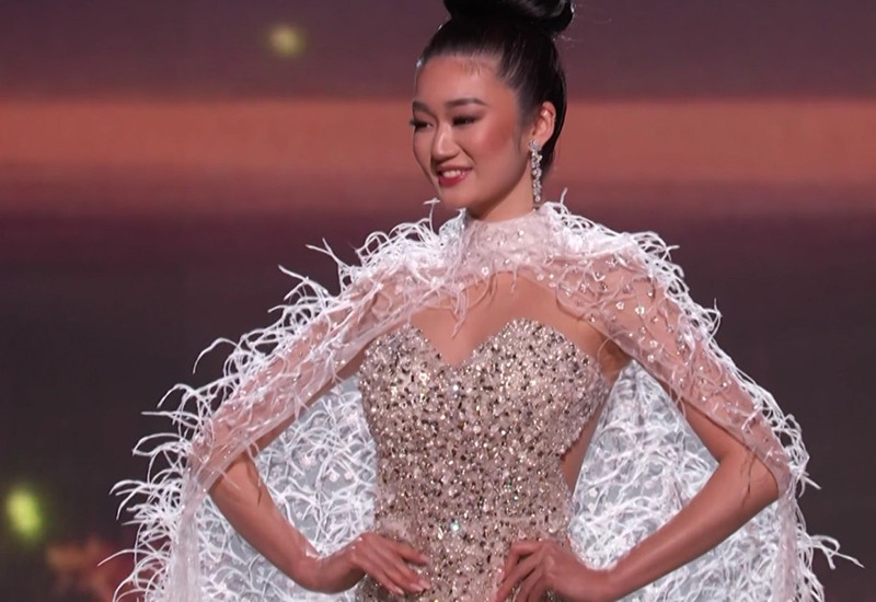 Ngọc Châu là thí sinh cuối cùng bước ra trong chiếc váy hồng ôm sát cơ thể, thiết kế đính đá tỉ mỉ. Đại diện Việt Nam thể hiện phong thái tự tin.